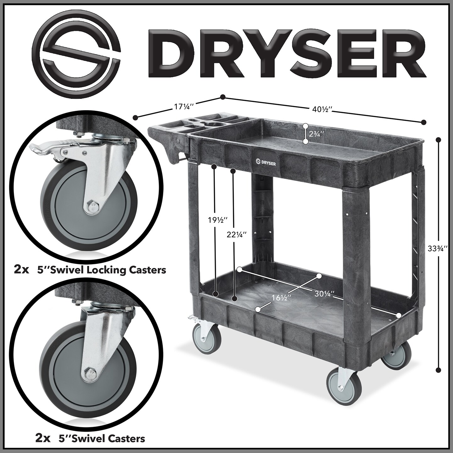 Dryser Utility Cart with Wheels, 40" x 17" Heavy Duty 550 lb. Capacity with Shelves - 2 Tier Rolling Cart with Four 5" Swivel Casters for Warehouse, Garage, Cleaning