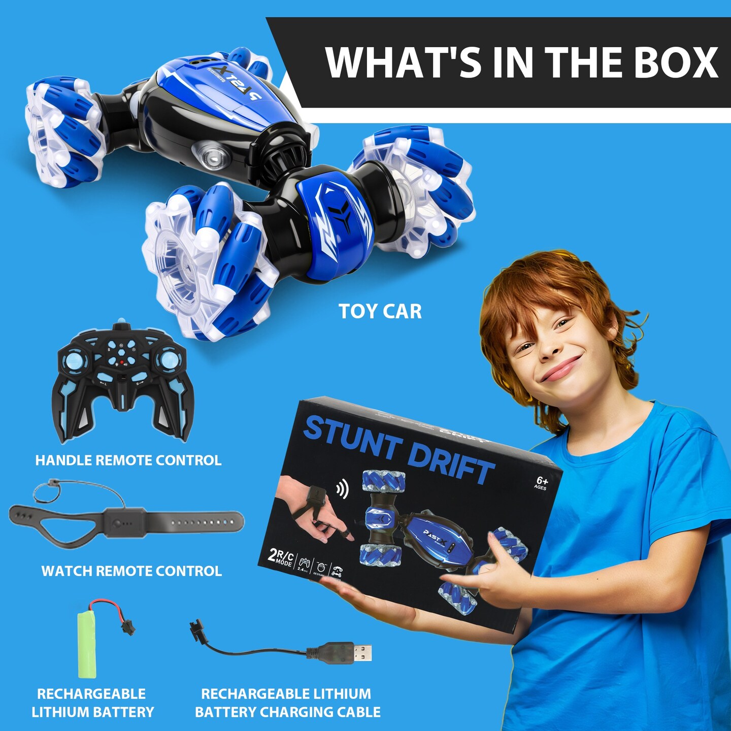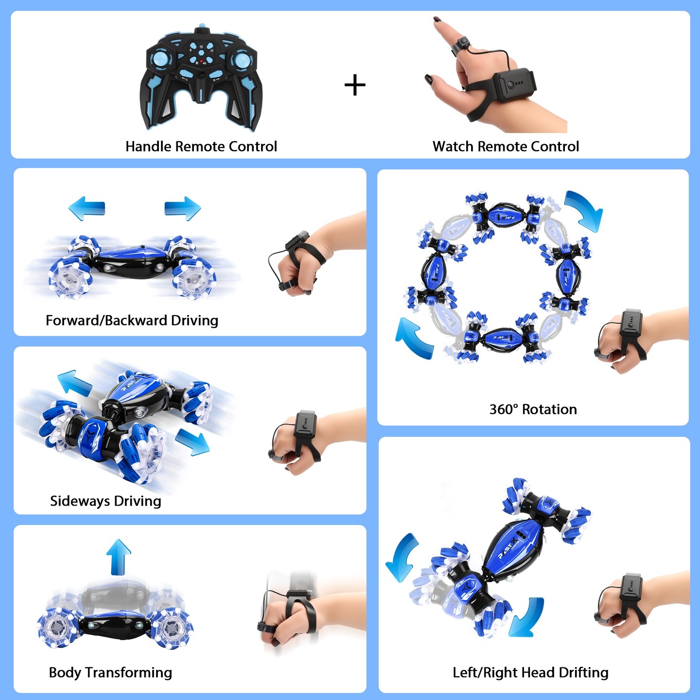 Dual Control Twisted Car Blue Remote & Gesture Control 360° Rotation, All-Direction Drift, 45° Inclined Climbing Stunt Toy for Kids & Adults