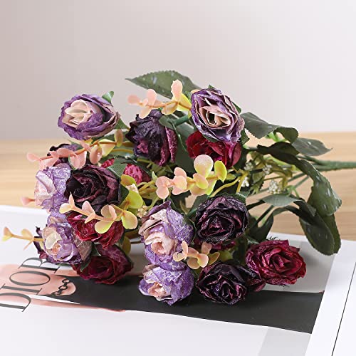 Duovlo 7 Branch 21 Heads Artificial Flowers Bouquet Mini Rose Wedding Home Office Decor,Pack of 2 (2 PCS Purple)