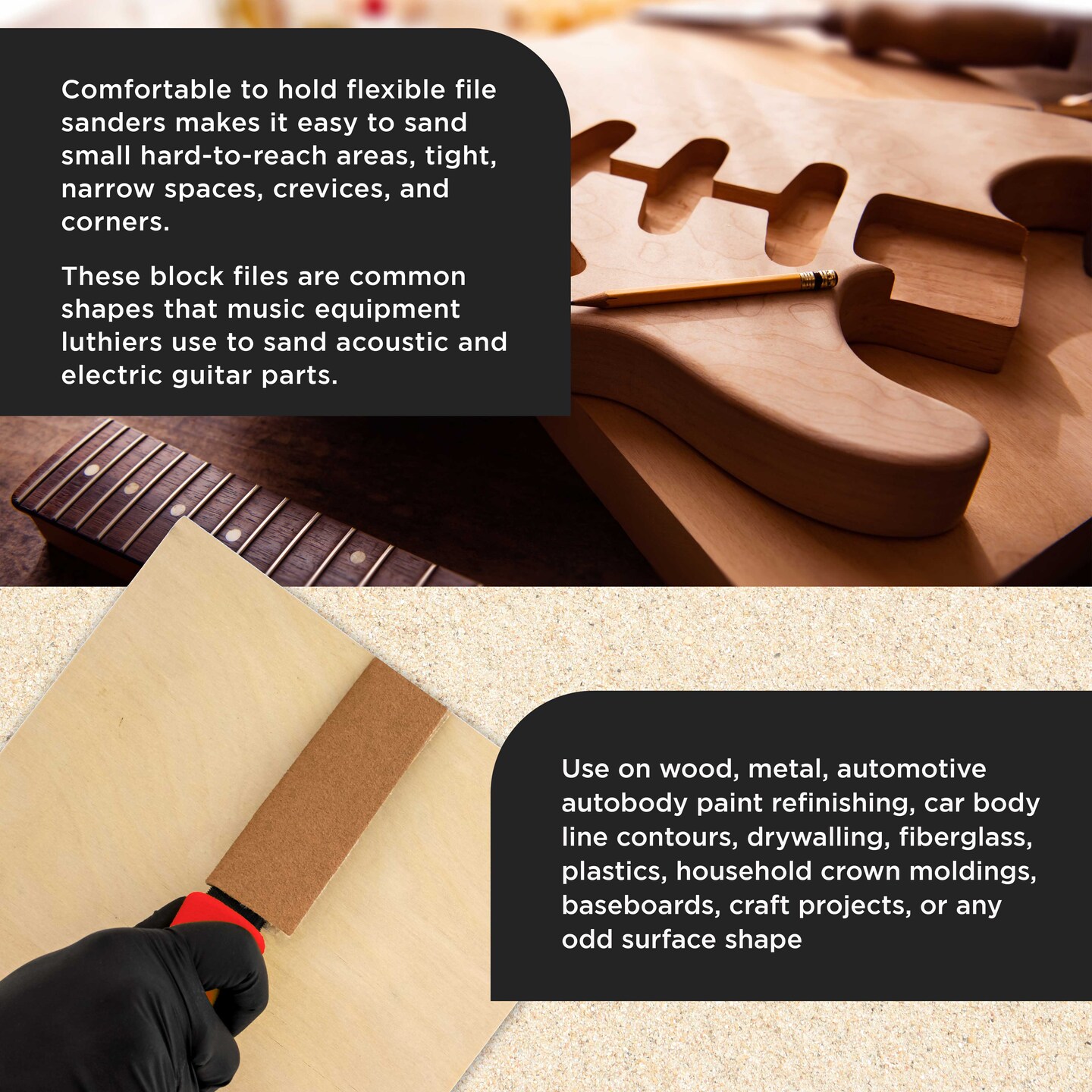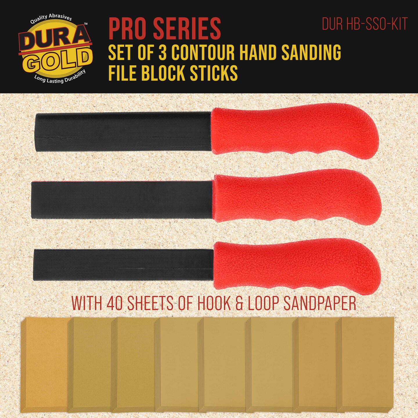 Dura-Gold Set of 3 Contour Hand Sanding File Block Sticks with 40 Sheet Hook & Loop Sandpaper Kit - 3 Different Convex Radius Profile Shapes, Teardrop