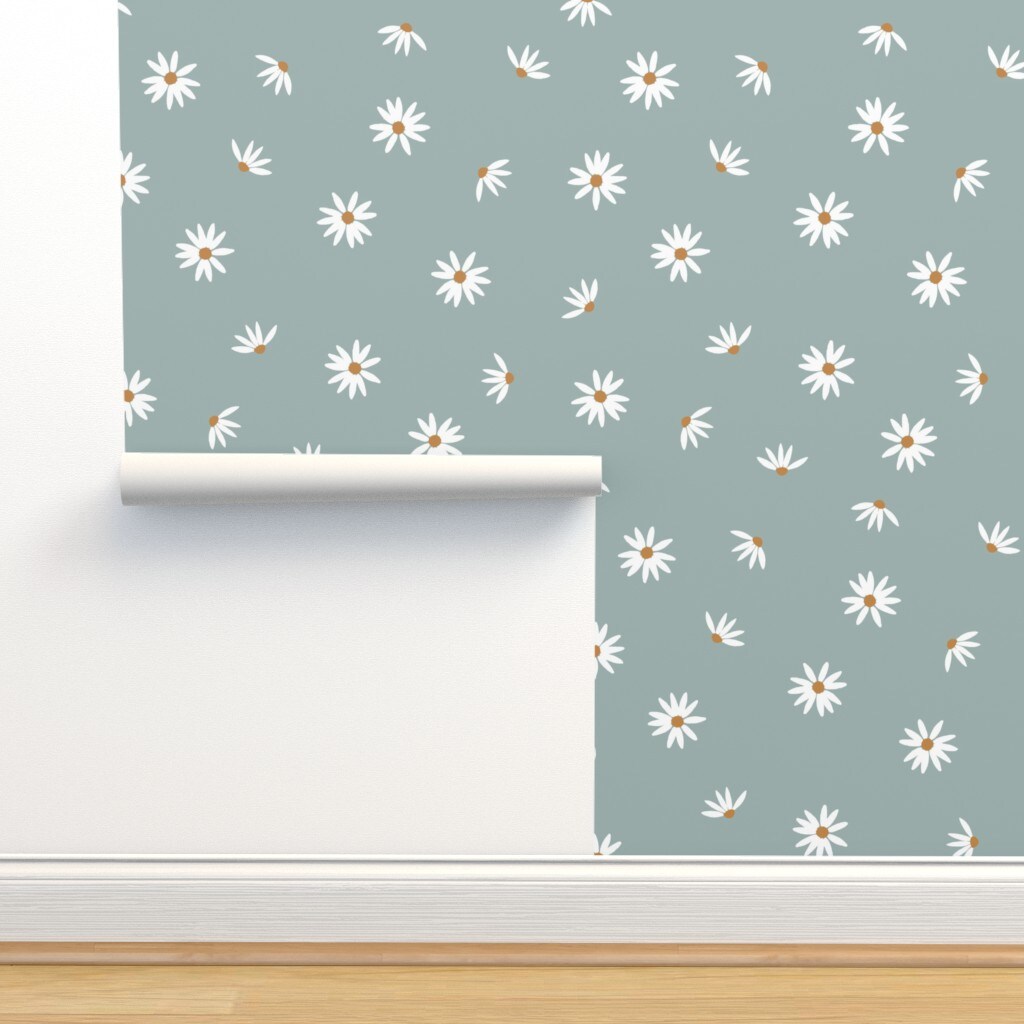 Dusty Blue Floral Ditsy Coneflower White Flowers Small Scale Boho Kids Whimsical Meadow Custom Pre-pasted Wallpaper by Spoonflower Pre-Pasted Wallpaper 2FT Wide