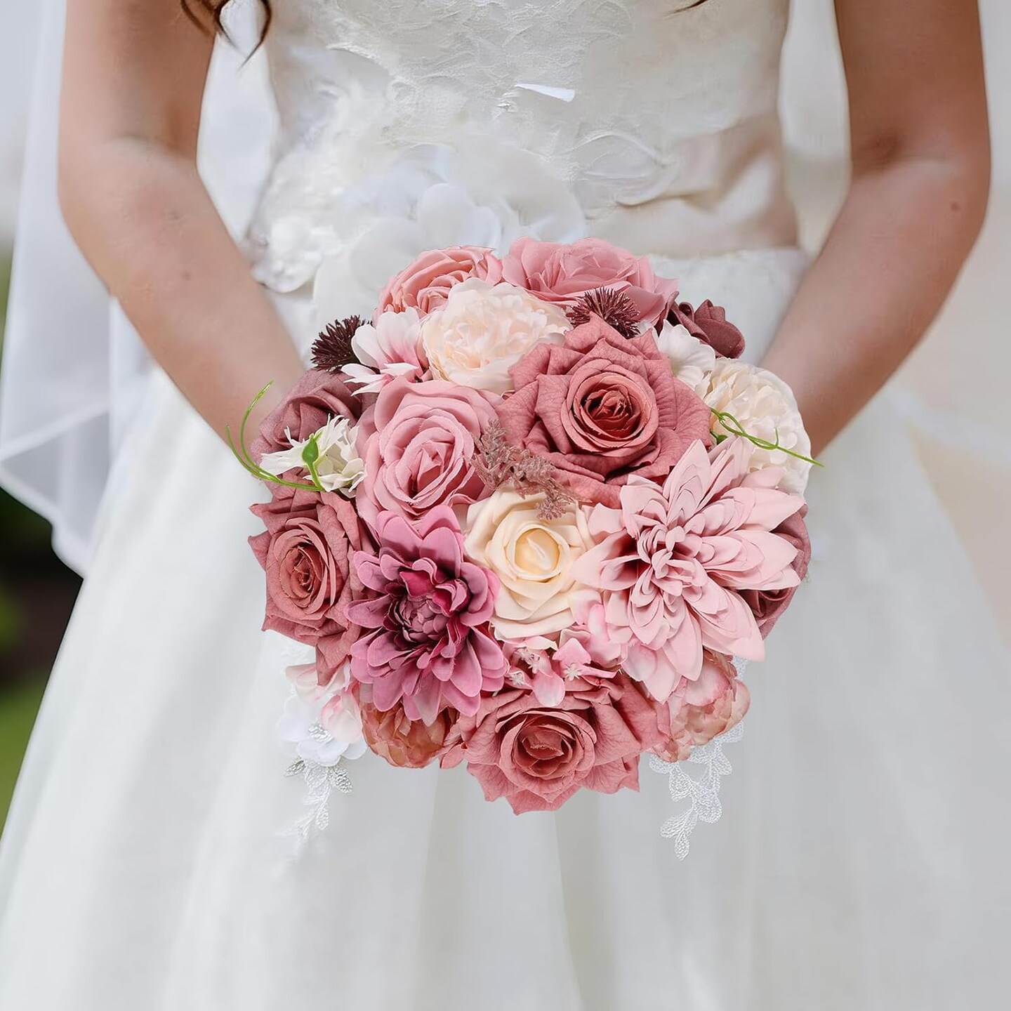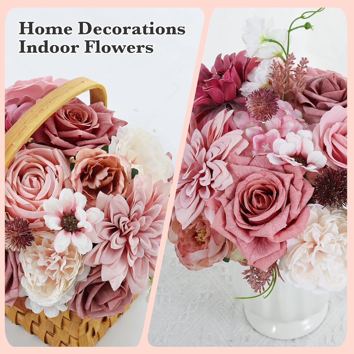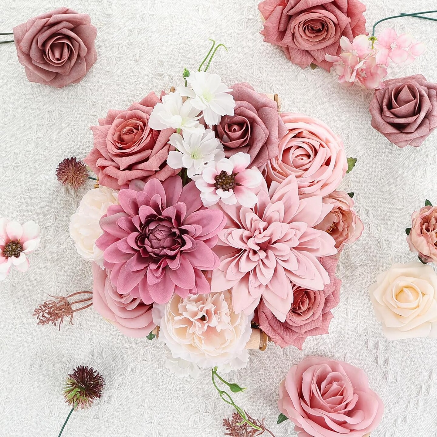 Dusty Pink Artificial Flower Combo Set – Faux Silk Roses, Peonies, Dahlias & Hydrangeas for Wedding Bouquets, Bridal Shower Centerpieces, Party Decorations & DIY Floral Arrangements