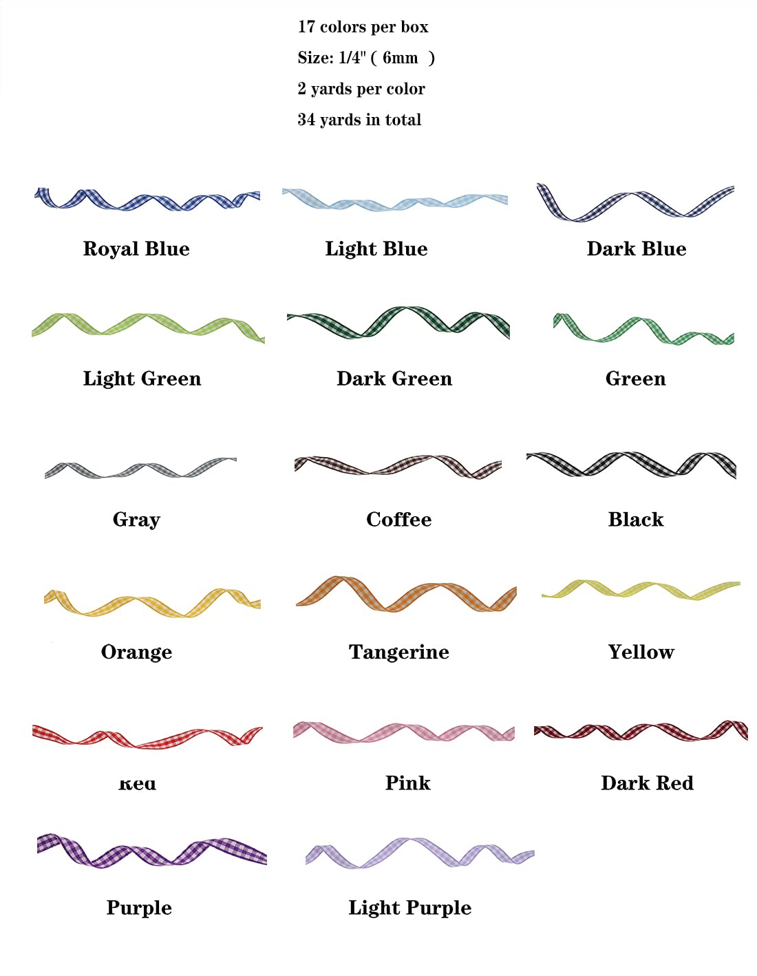 DXEUD 34 Yards 17 Colors Gingham Ribbon Checkered Ribbon Gingham Woven Edge Ribbon for Gift Package Wrapping, Sewing, Hair Bow... (1/4 Inch)
