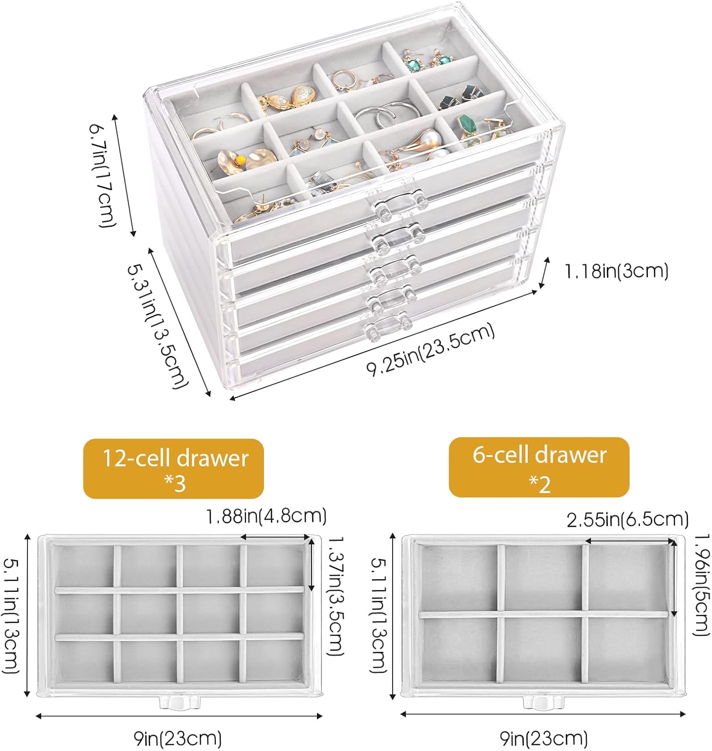Earring Holder Organizer Jewelry Box with 5 Drawers, Acrylic Clear Earring Case with Adjustable Velvet Trays for Women - Grey, 5 Layers