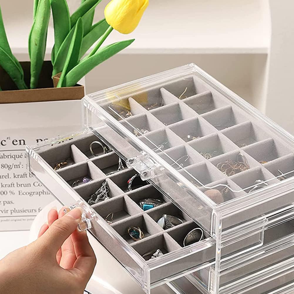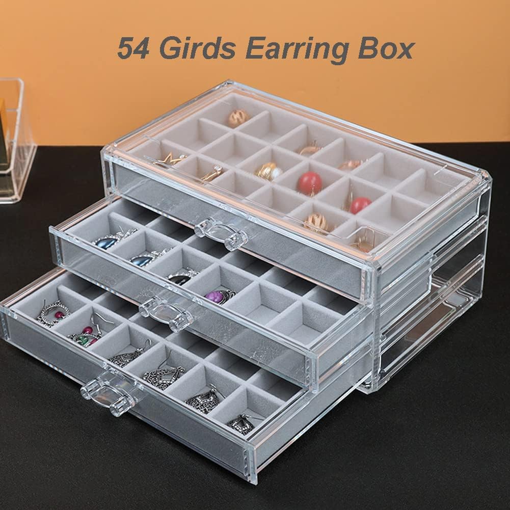 Earring Organizer Box Acrylic Jewelry Organizer with 3 Drawers 54 Adjustable Grids Clear Stackable Earring Holder Velvet Trays Ring Display Case for Women Girls (Gray)