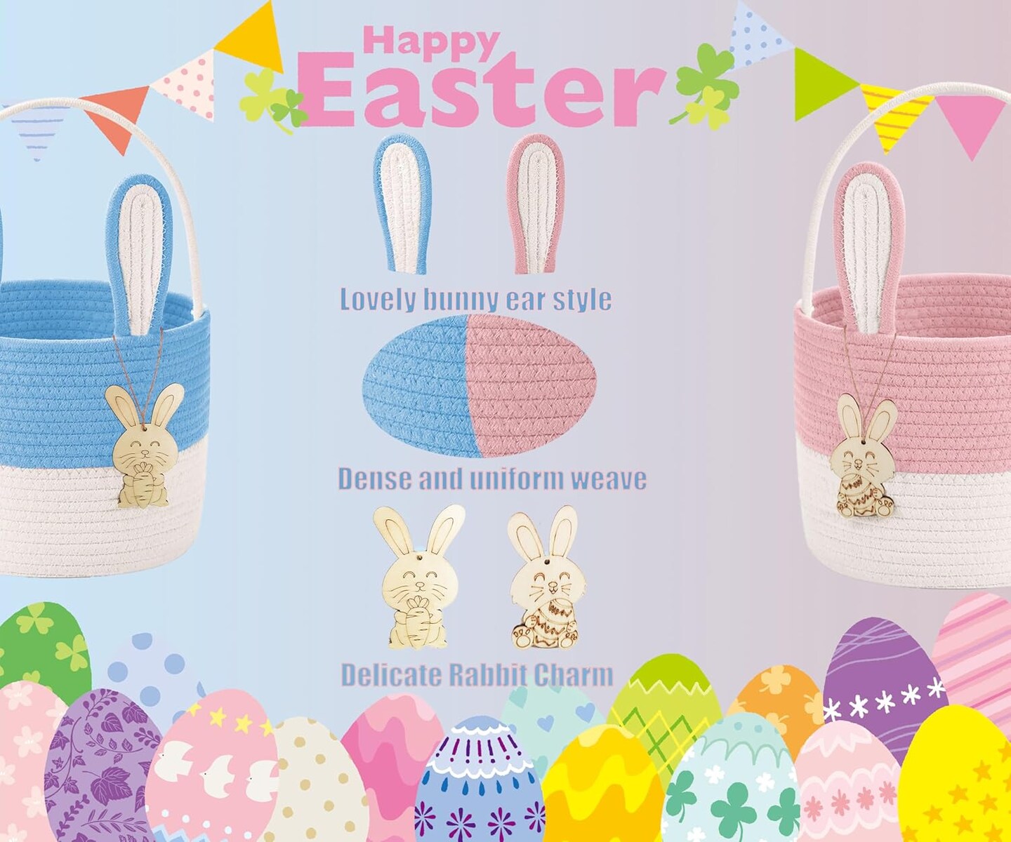 Easter Bunny Basket for Kids – Woven Cotton Rope Gift Basket with 3D Bunny & Wooden Pendant – Pink, Ideal for Toddlers, Boys & Girls