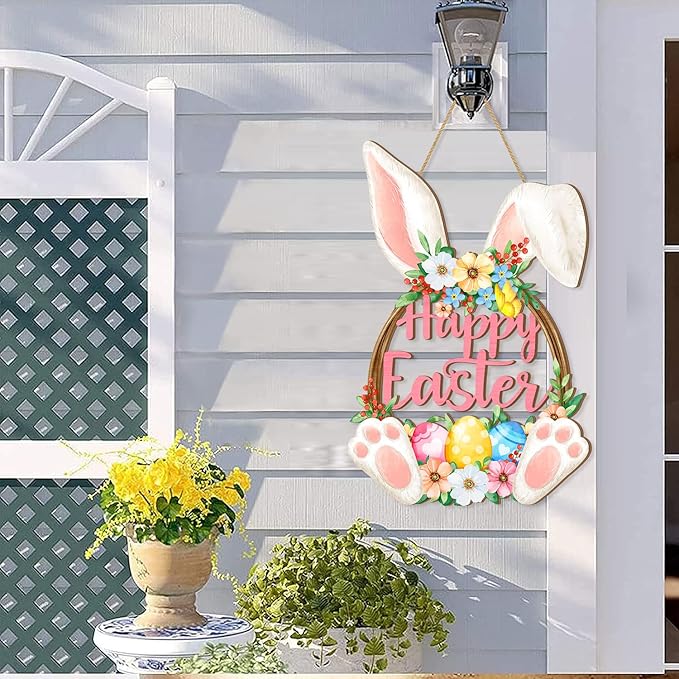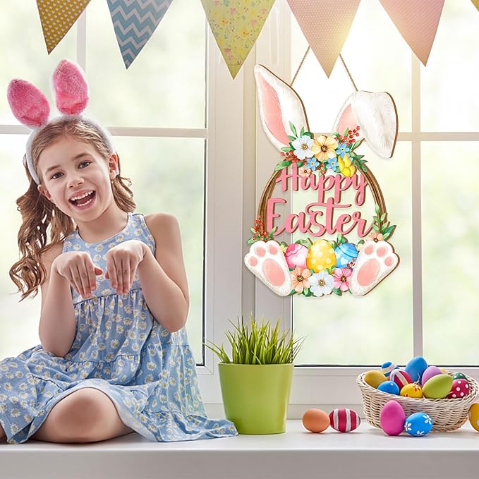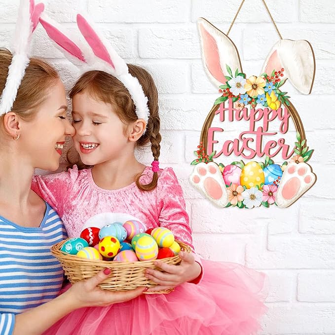 Easter Bunny Door Sign, Happy Easter Wooden Hanging Decorations, Easter Eggs Hanging Plaque Bunny Rabbit Sign Wall Hanger Floral Spring Decor for Front Door Porch Yard Wall Home Decorations Pink