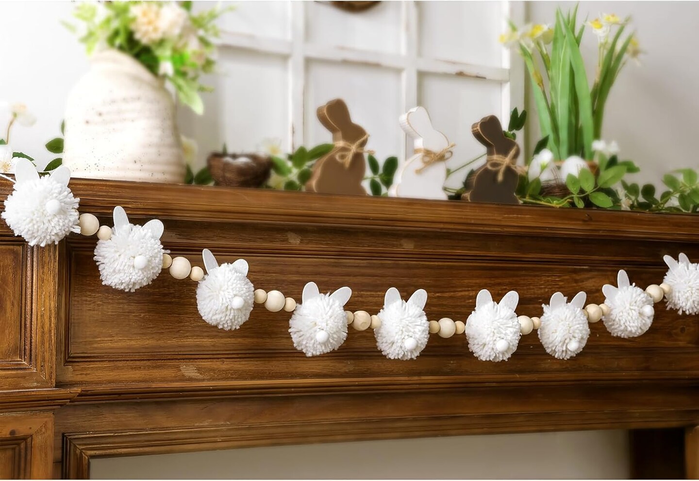 Easter Bunny Garland Decoration – Cute White Bunny with Wooden Beads, Rustic Rabbit Banner for Mantel, Fireplace, Farmhouse, Home & Office Indoor/Outdoor Spring Decor