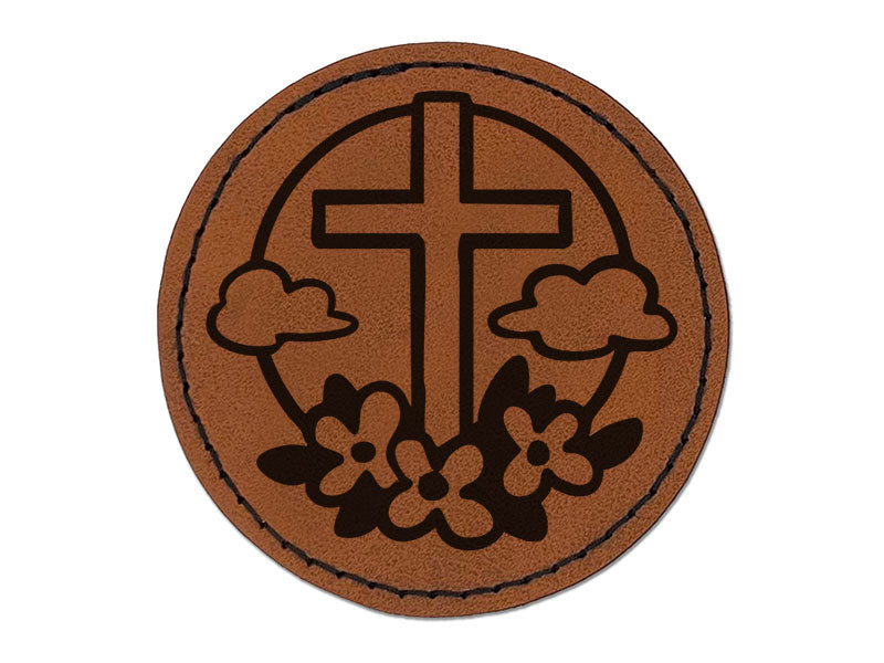 Easter Cross with Flowers and Clouds Round Iron-On Engraved Faux Leather Patch Applique - 2.5 Inch