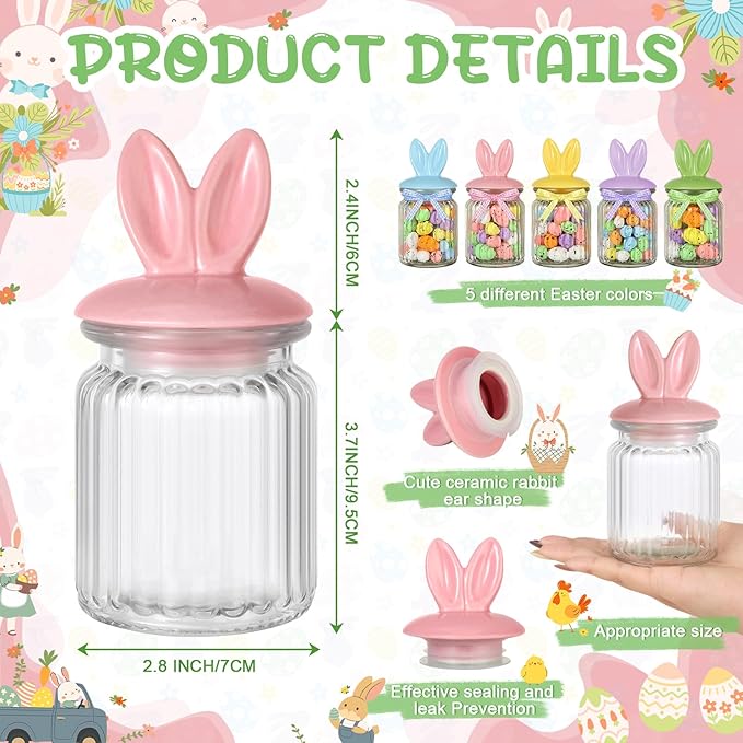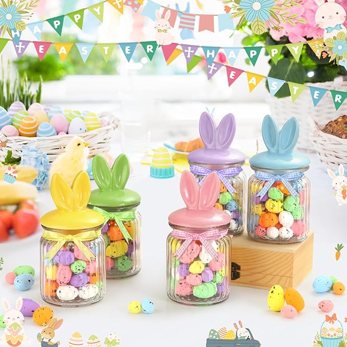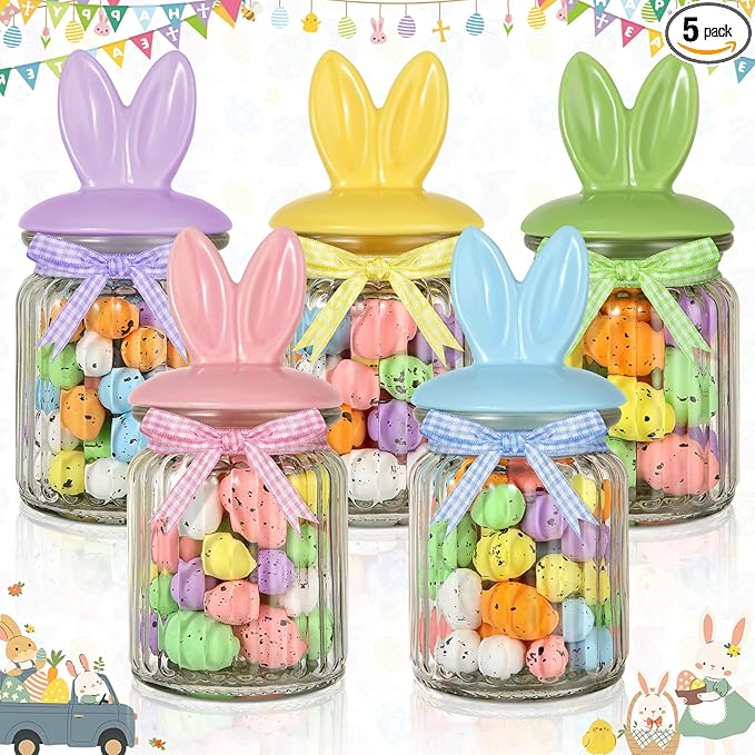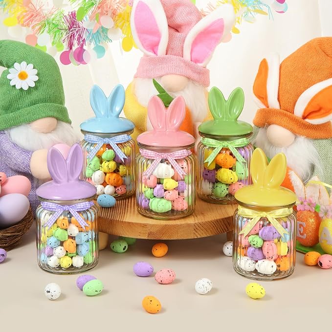 Easter Decorations - 5 PCS Easter Glass Candy Jar with Ceramic Bunny Shaped Lid Easter Cookie Decorative Jar with Gingham Ribbon Bows for Easter Table Centerpiece Decorations