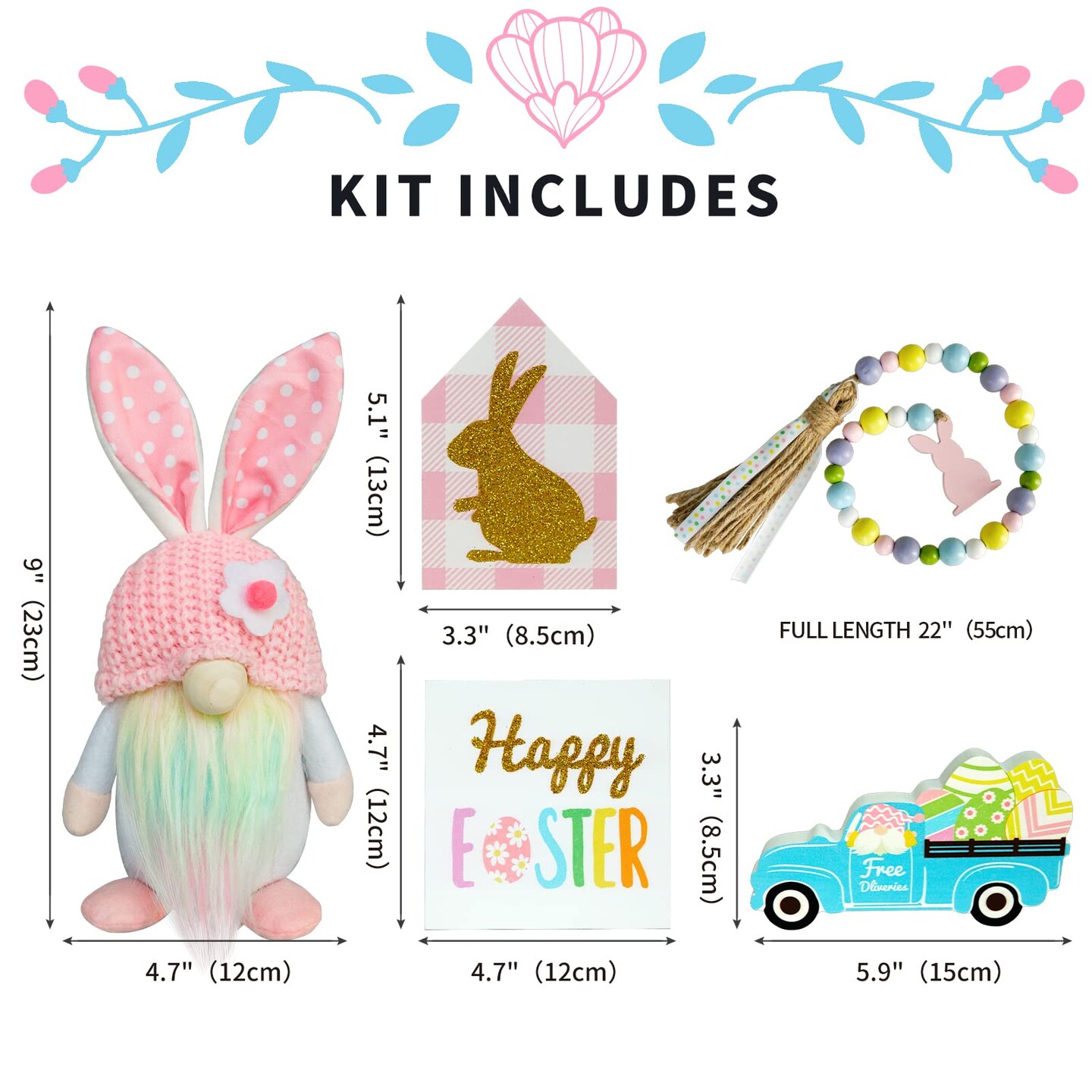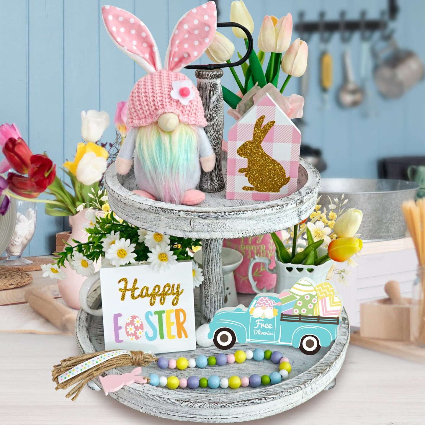 Easter Decorations, 5Pcs Easter Gnome Tiered Tray Decor, 3 Glitter Easter Wood Signs, Truck Full of Eggs, Easter Bunny Gnome Plush, Spring Easter Bead Garland,Rustic Farmhouse Spring Easter Decor