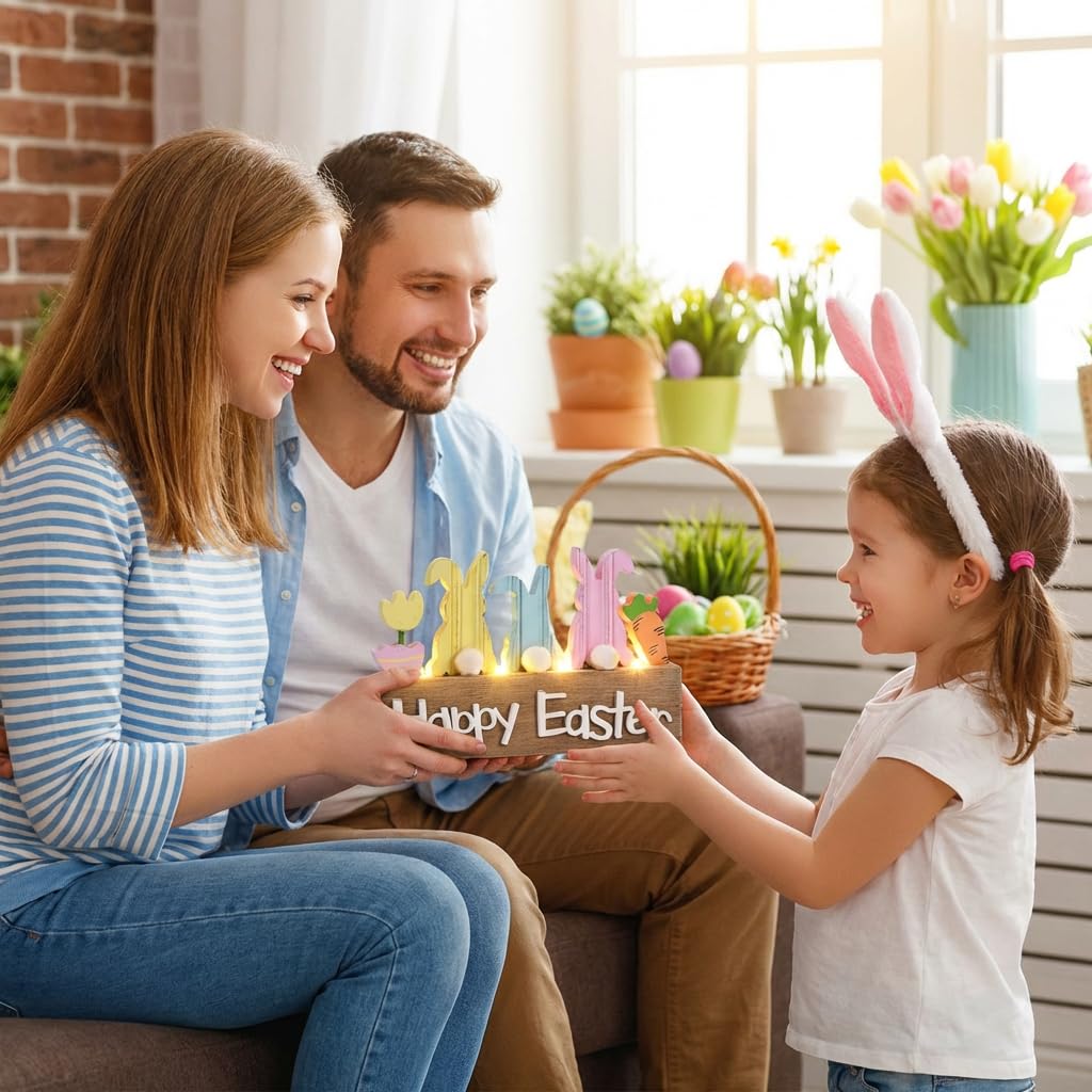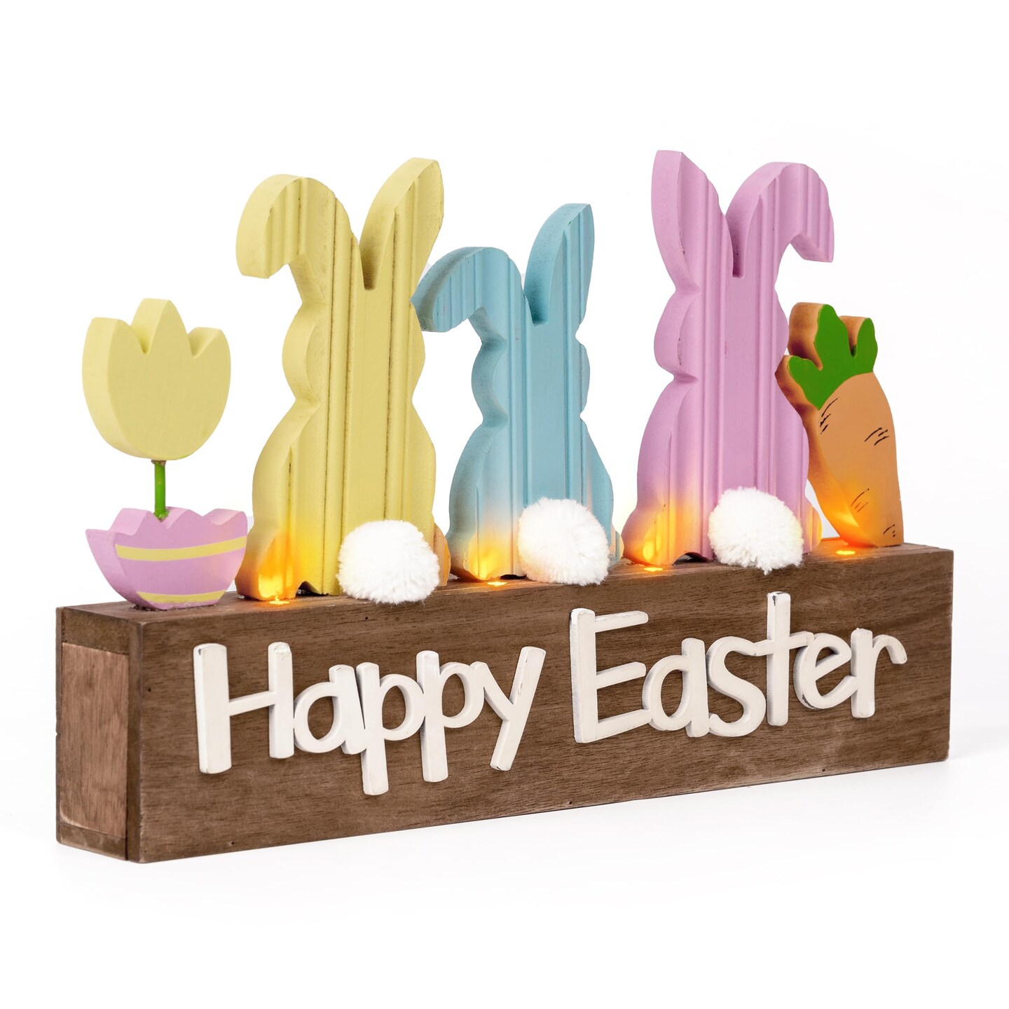 Easter Decorations, Wooden Easter Decor for Table with LED Lights, Lighted Bunny Decorations for The Home Decor Shelf Tiered Tray Living Room, 8 Inch, Pink Blue