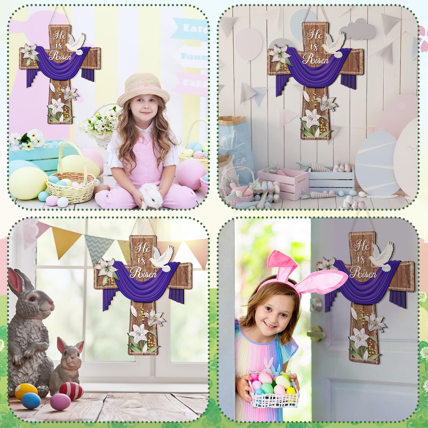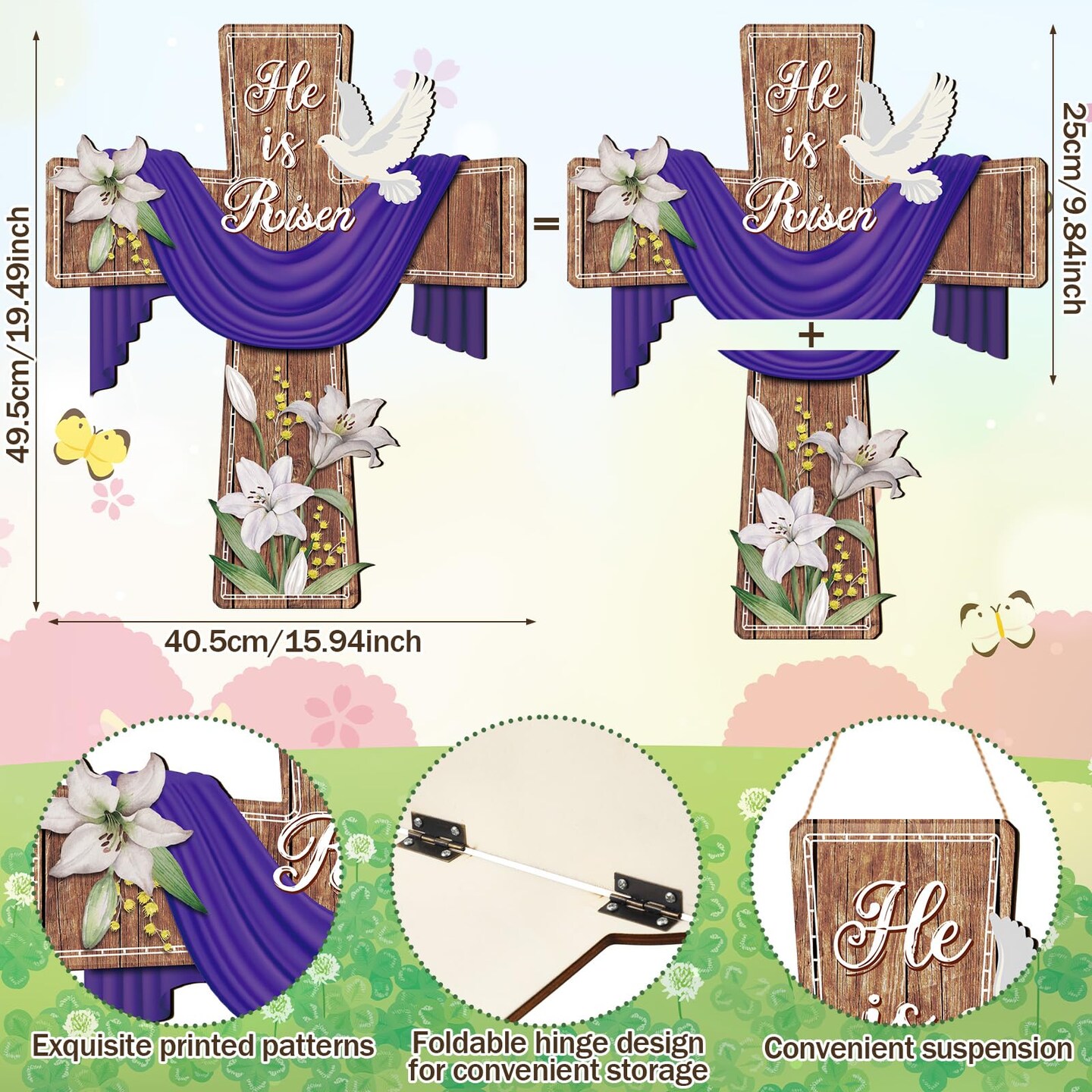 Easter Door Sign He Is Risen Hanging Decor Religious Cross Sign Easter Wreaths for Front Door Christian Flowers Lent Hanging Hanger for Farmhouse Front Porch(Cross,15.75 x 19.69 Inches)
