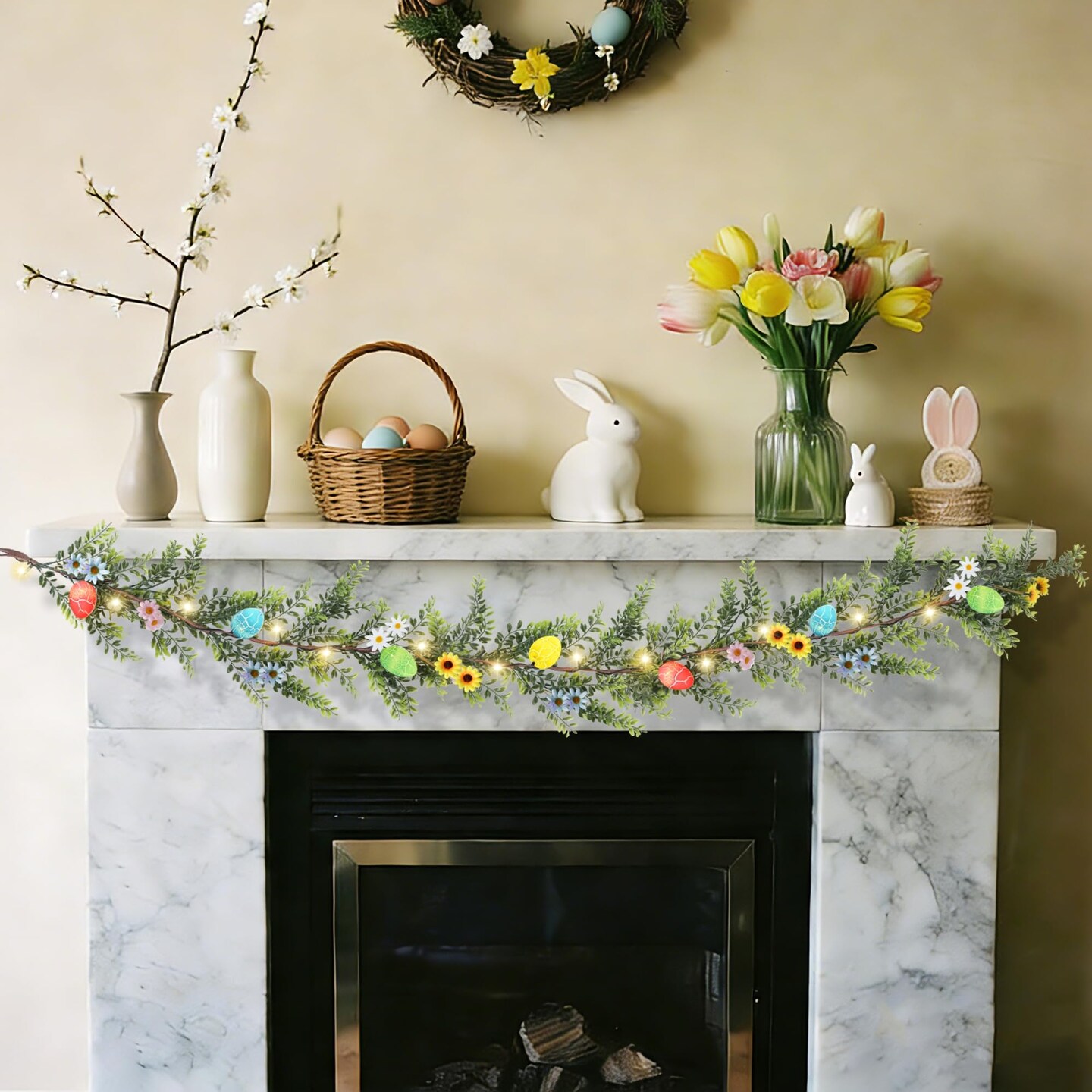 Easter Garland Decor, 6.5 FT LED Lighted Garland with Easter Eggs & Flowers, Spring Floral Decoration for Fireplace, Mantle, Table & Indoor Home Decor