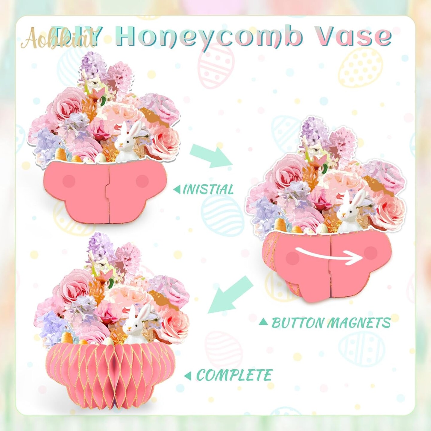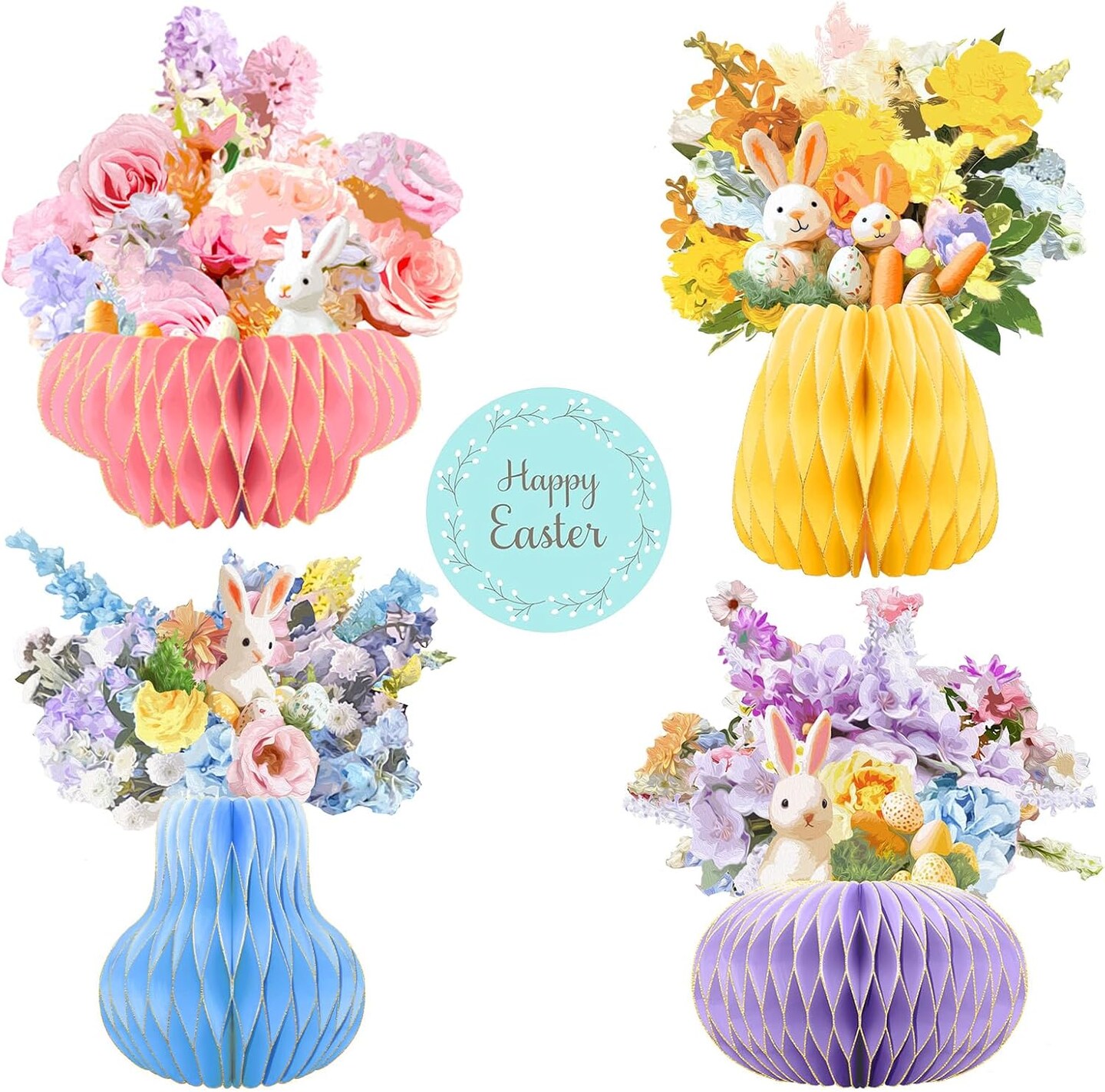 Easter Party Decorations – Paper Honeycomb Vase with Bouquet Print & Glitter Edge, Bunny & Egg Easter Table Centerpiece for Home, Office, Party Decor