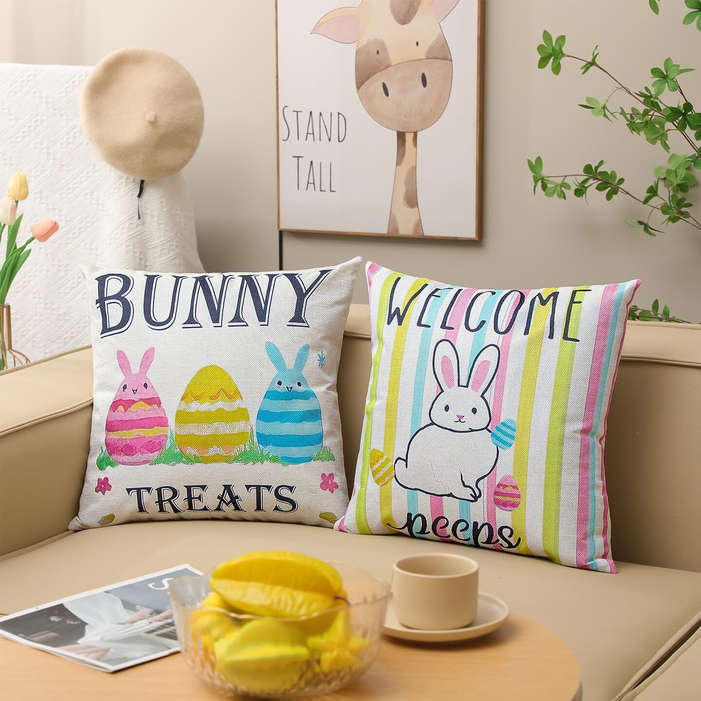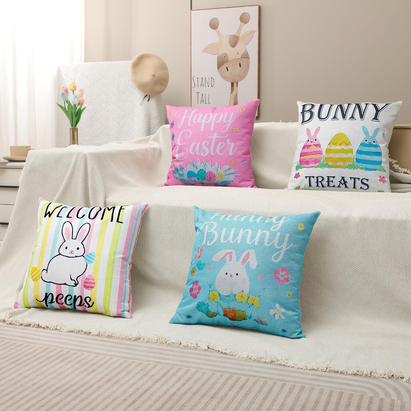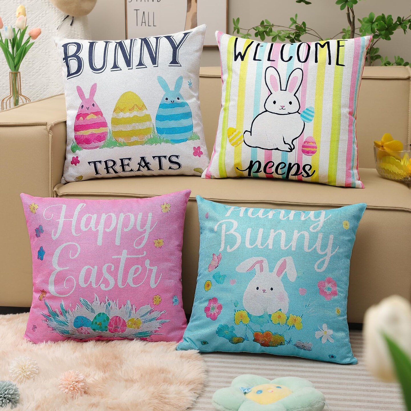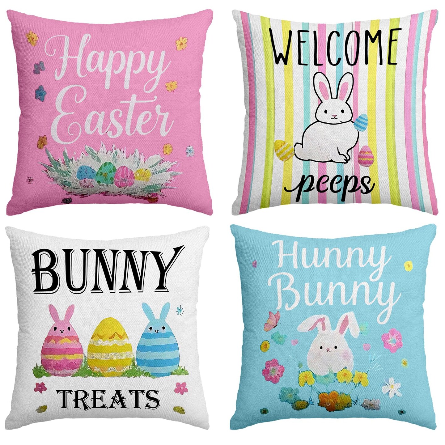 Easter Pillow Covers 18 x 18 Inch,Easter Decorations for Home,Set of 4 Happy Easter Hunny Bunny Pink Blue Decorative Throw Pillow Covers Spring Farmhouse Decor