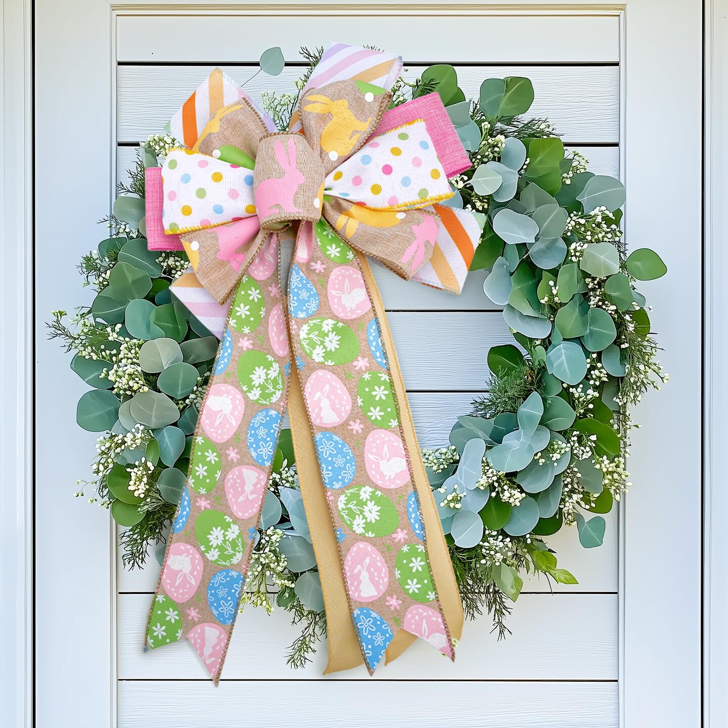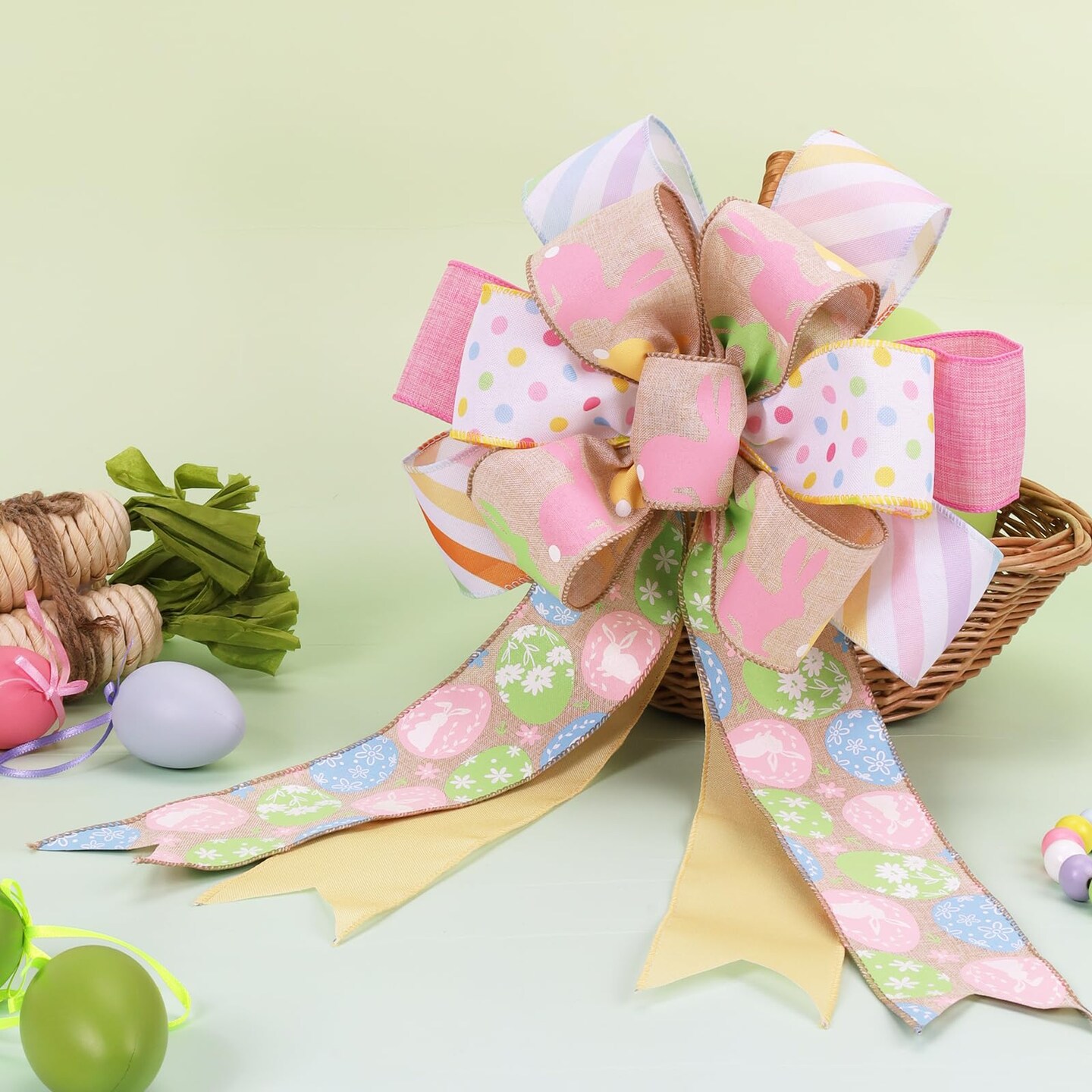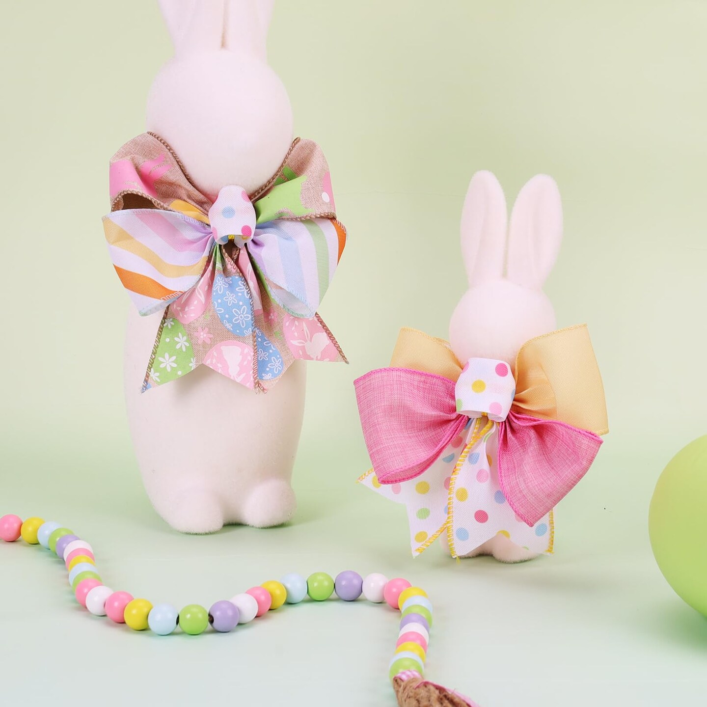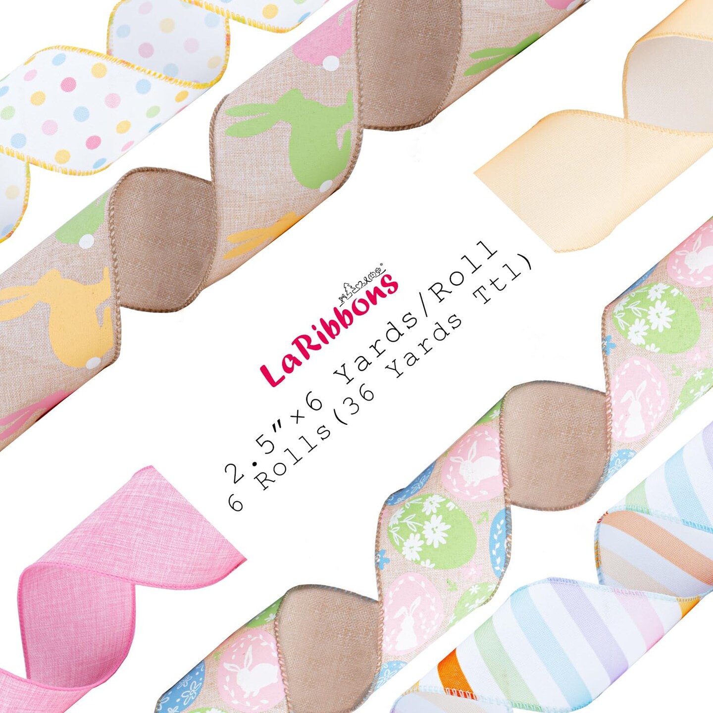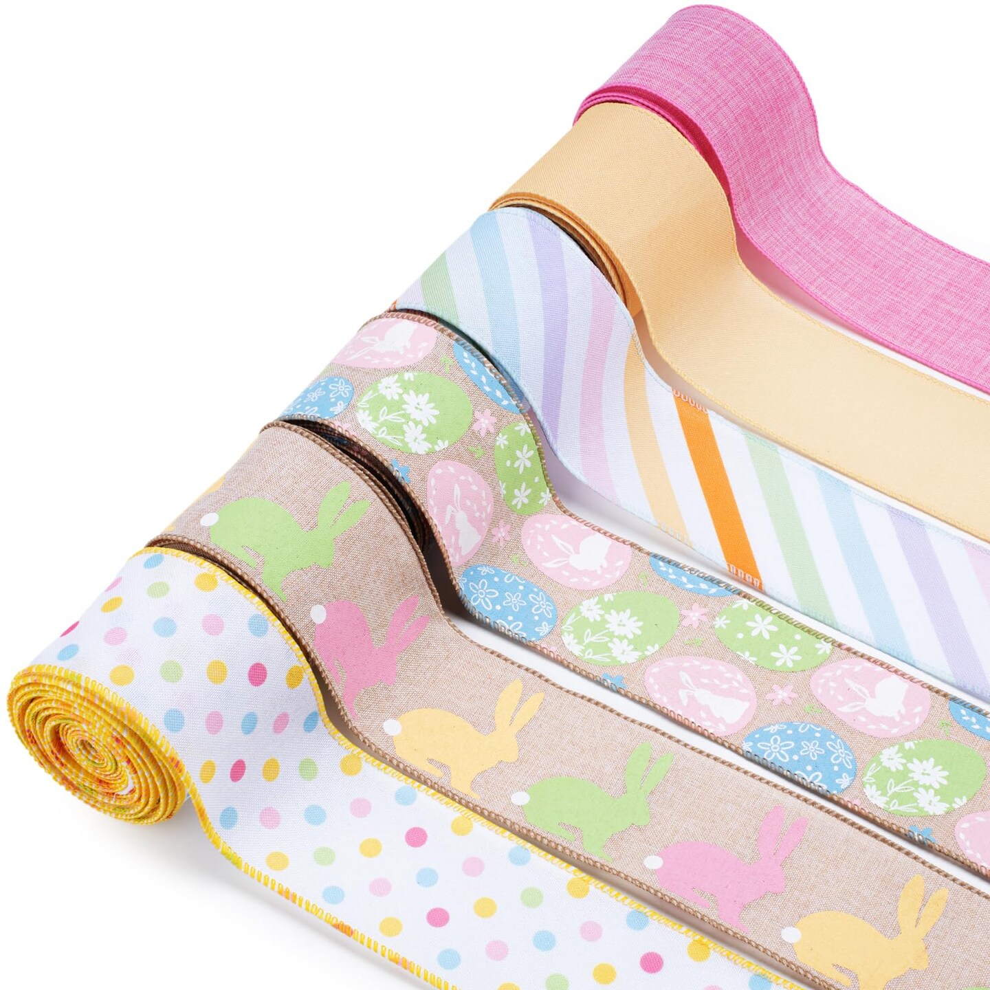 Easter Ribbon Wired 6 Rolls 2.5 Inch x 36 Yards TTL, Eggs and Bunny Easter Ribbons for Baskets, Striped and Polka Dot Wide Ribbons for Crafts Spring Wreath Gift Wrapping Bow Decoration