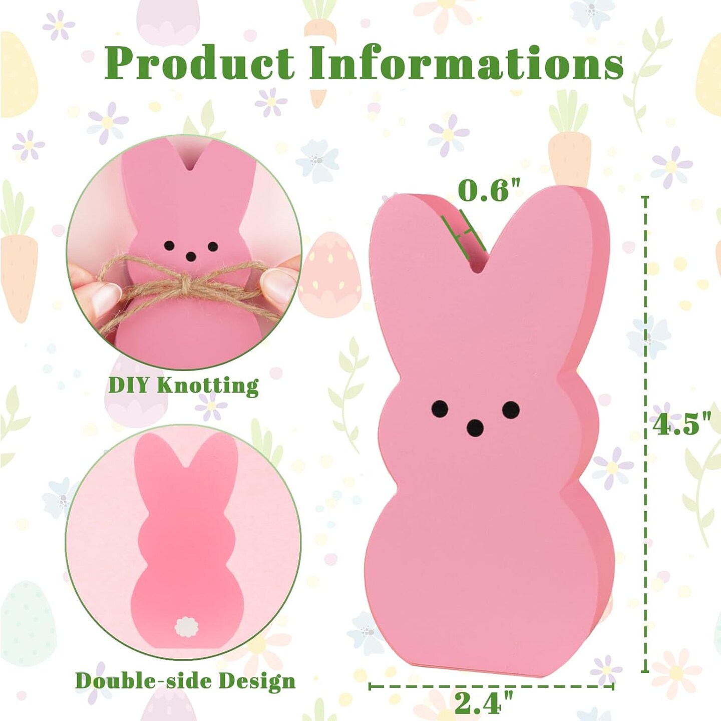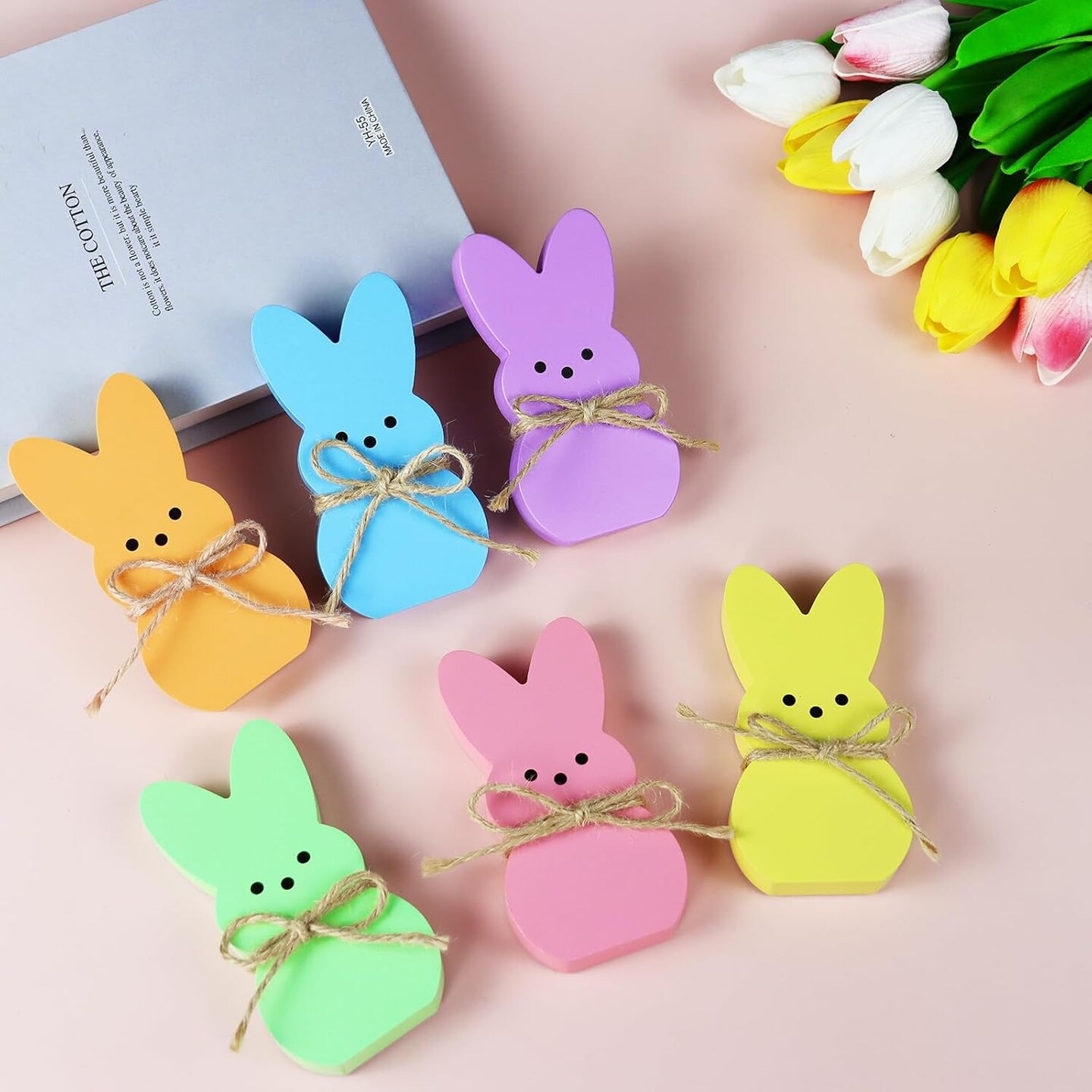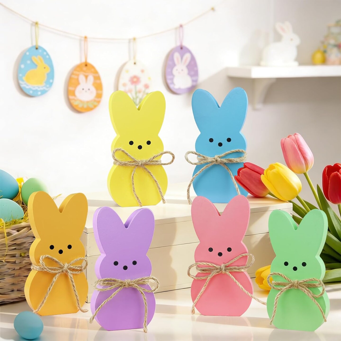 Easter Table Decorations – 6PCS Wooden Bunny Easter Signs with Rope, Cute Rabbit Décor for Home, Tiered Tray, Mantel, Office, Kitchen, Tabletop Centerpiece, Shelf, Vase, Spring & Holiday Party