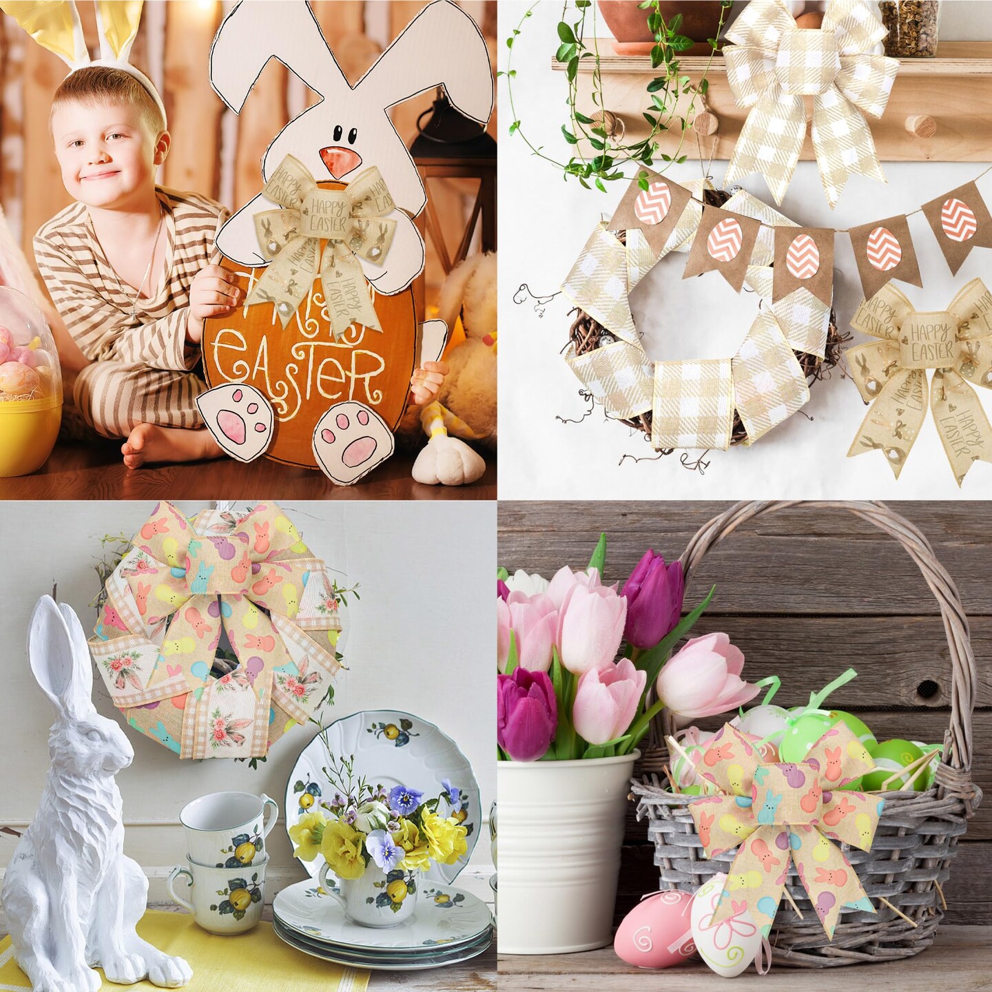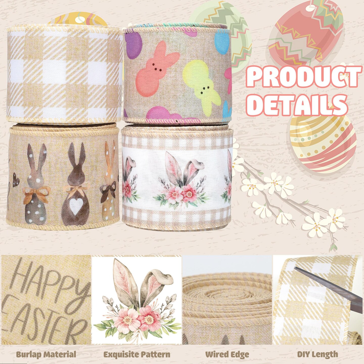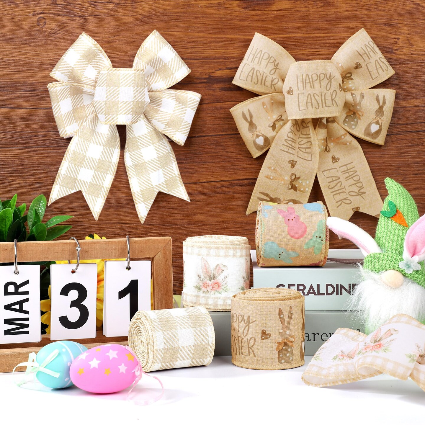 Easter Wired Edge Ribbon Farmhouse Bunny Burlap Ribbons 2.5" Plaid Rustic Peeps Wired Ribbon for Easter Holiday Gift Wrapping Wreath Bow Decor DIY Craft, 24 Yards