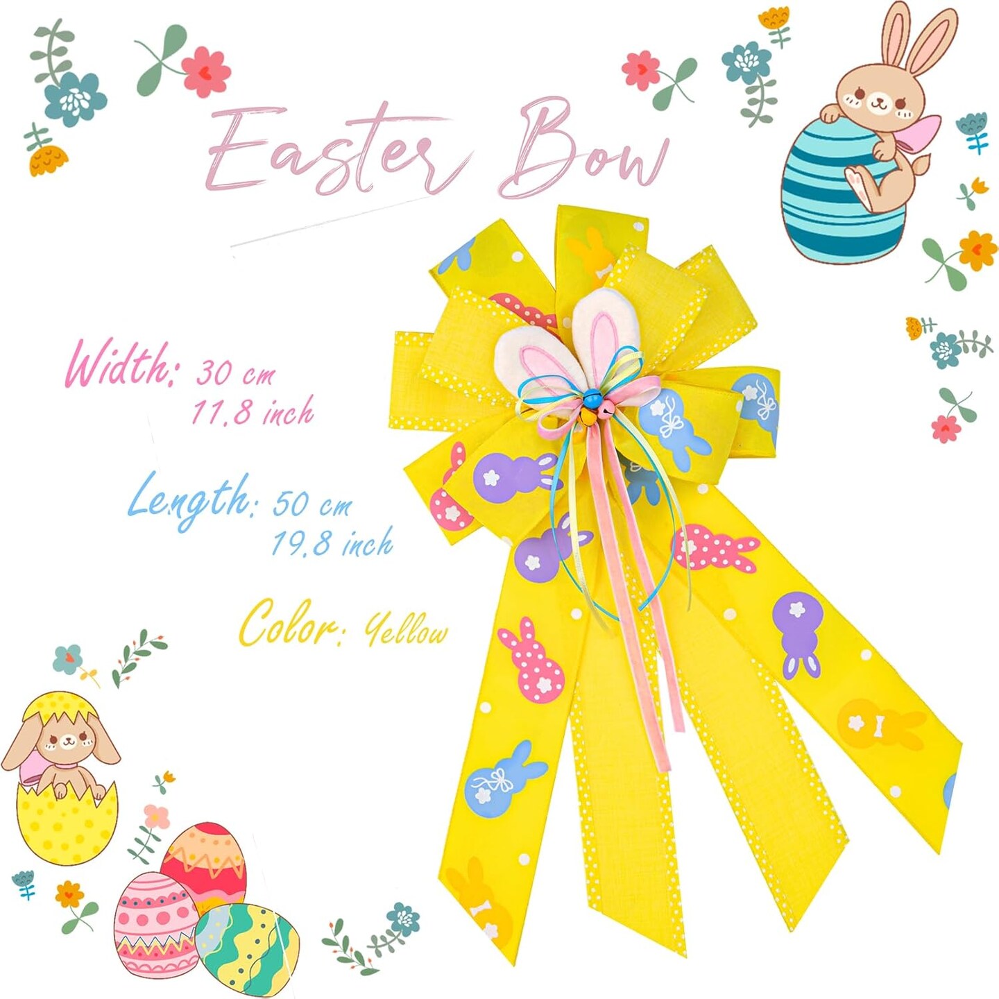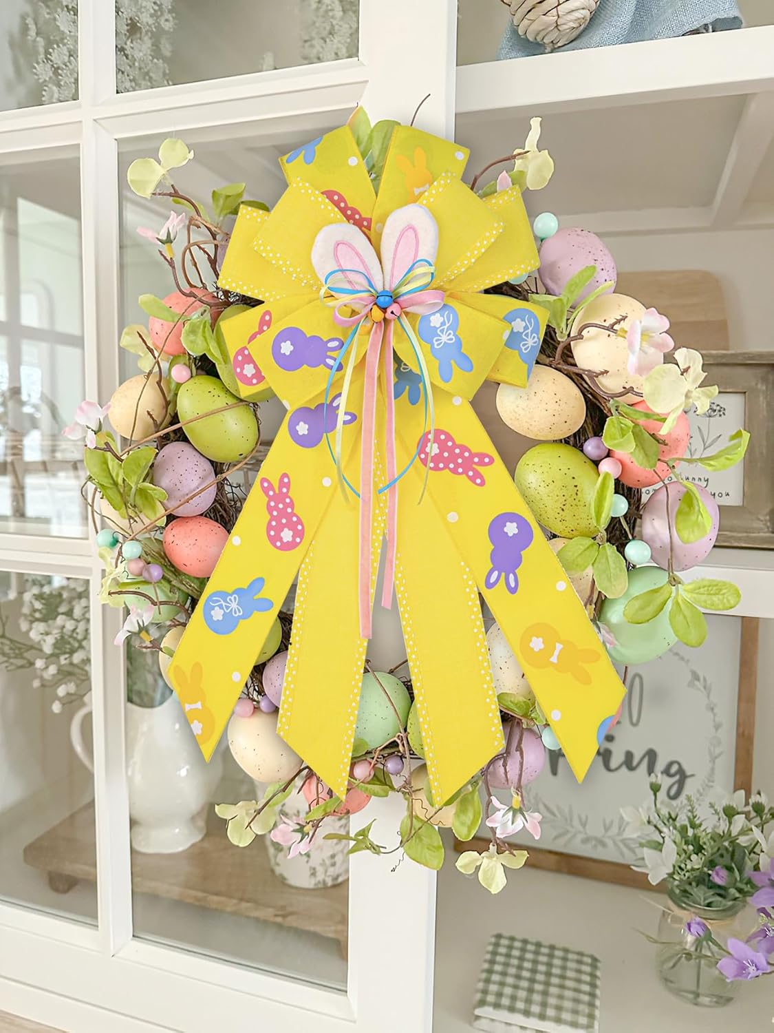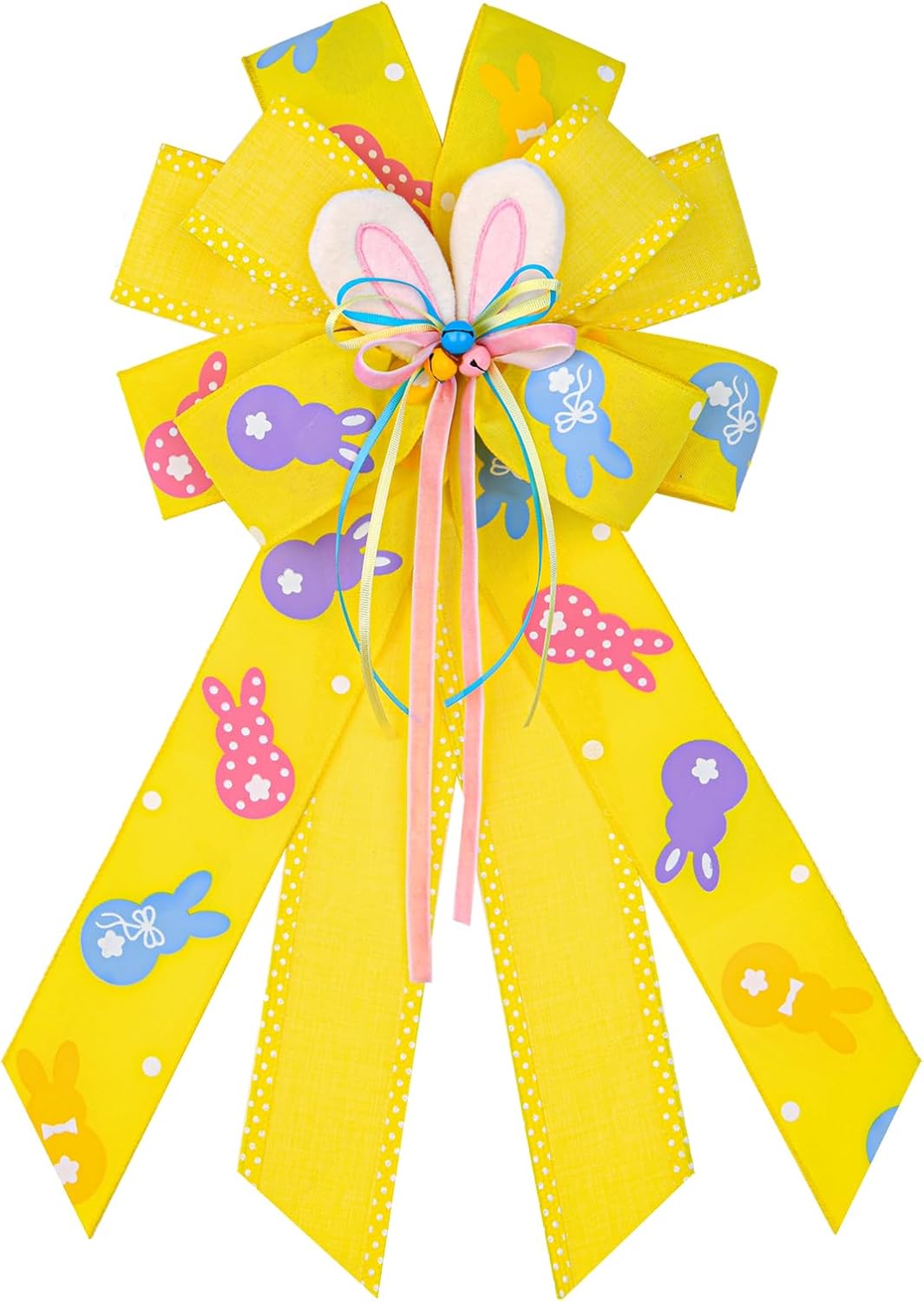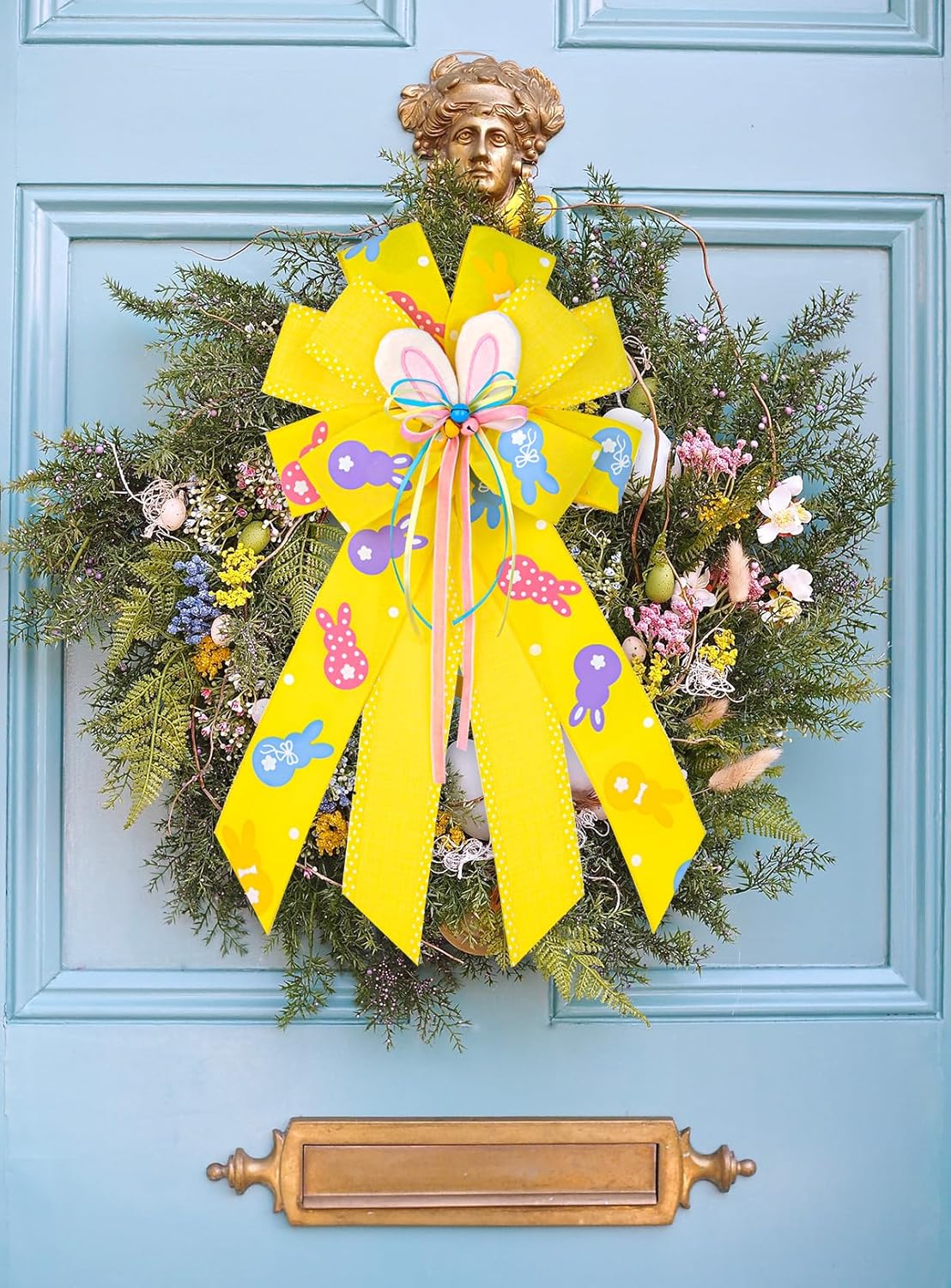 Easter Wreath Bows, Large Easter Rabbits Burlap Bows Holiday Bow Rabbits Bunny Bows for Wall Indoor Outdoor Decor (Yellow)