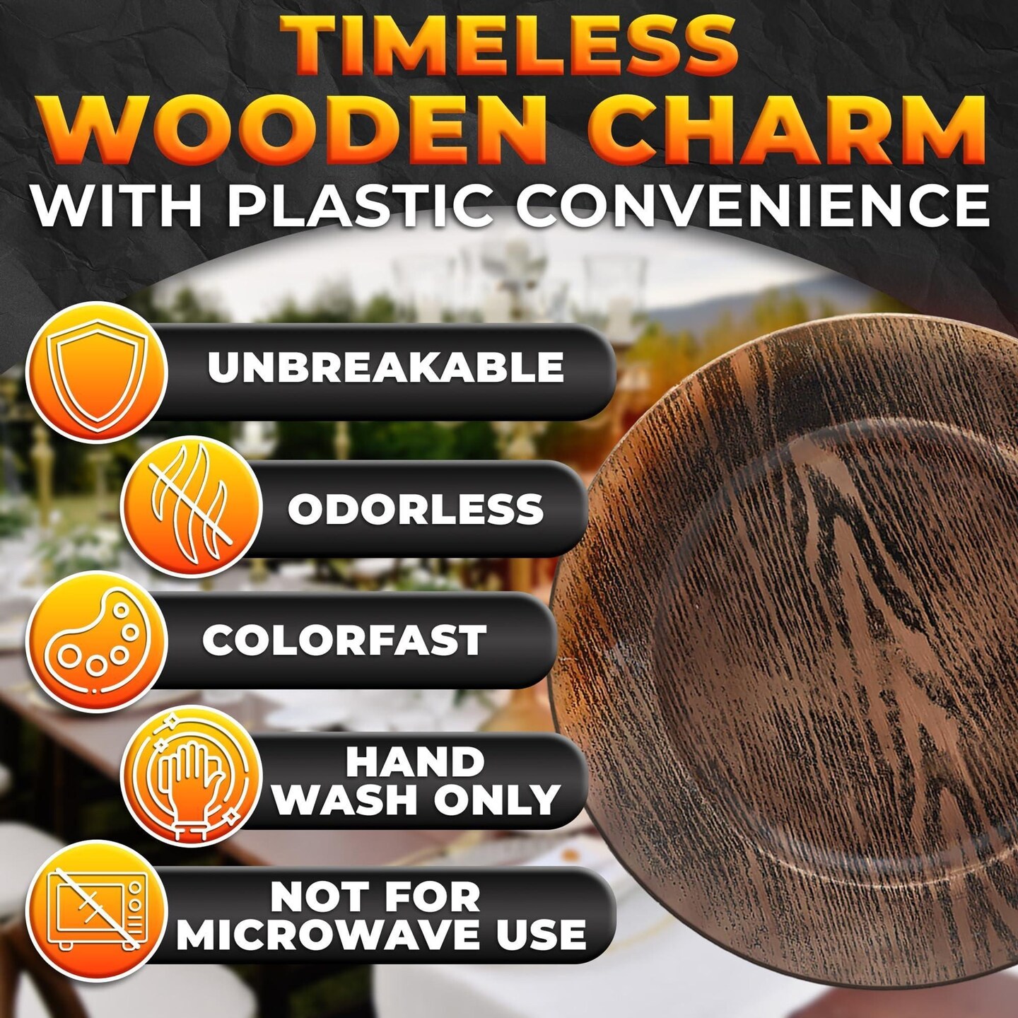 Edge Collections - 13" - Brown - Elegant Rustic Plastic Charger Plates for Dining - 4 Piece