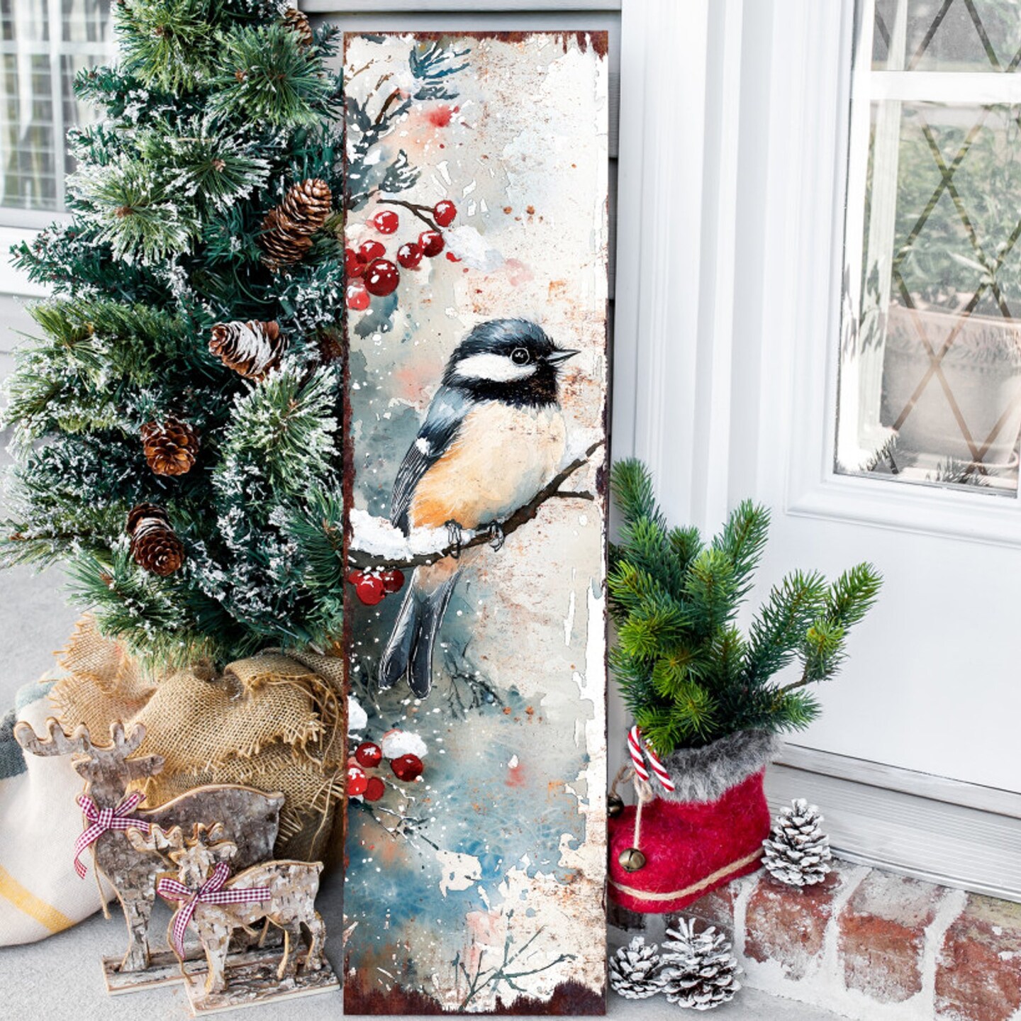 Edge Collections - 36" x 10" - Multicolor - Charming Christmas Chickadee Porch Sign - 1 Piece