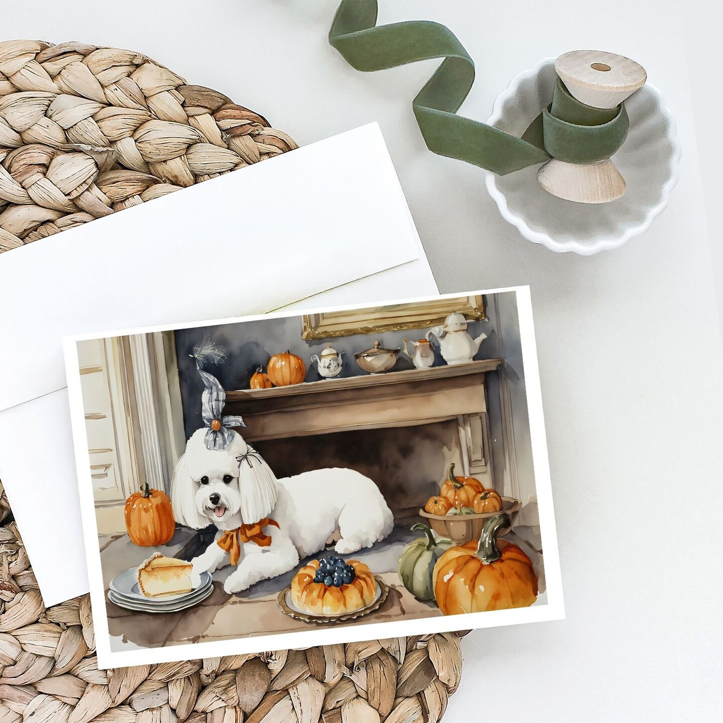Edge Collections - 5" x 7" - Multicolor - Bichon Frise Fall Kitchen Pumpkins Greeting Cards - 8 Pieces