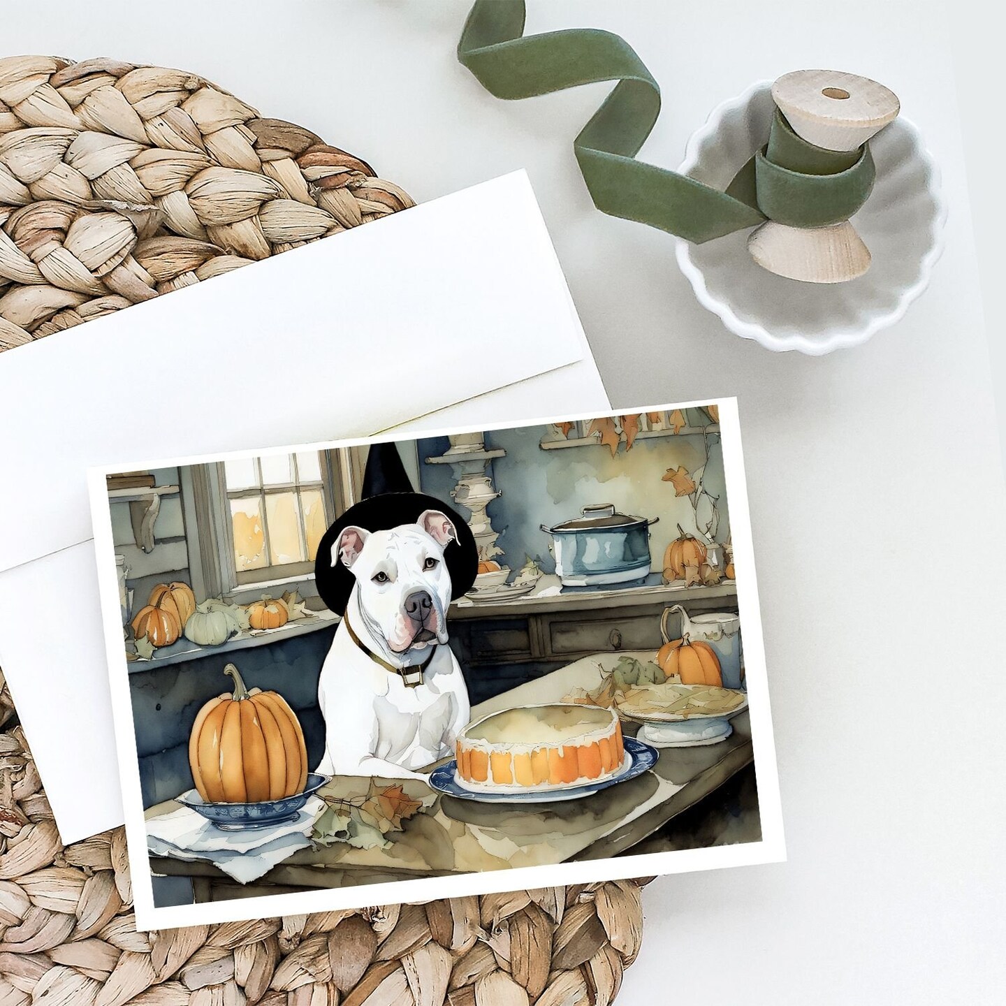 Edge Collections - 5" x 7" - Multicolor - Pit Bull Terrier Fall Kitchen Pumpkins Greeting Cards - 8 Pieces