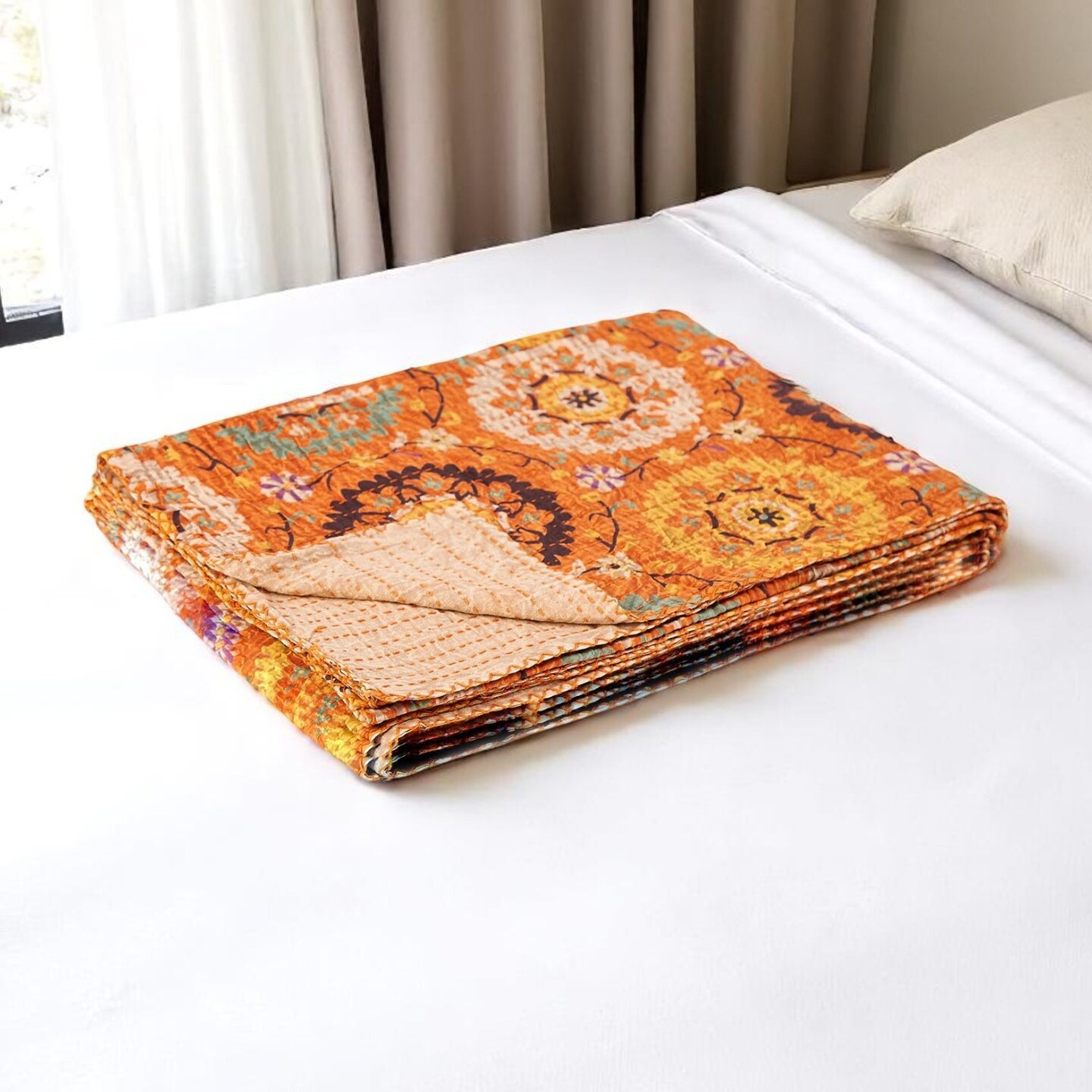 Edge Collections - 50" x 70" - Orange - Artisanal Floral Kantha Throw Blanket - 1 Piece