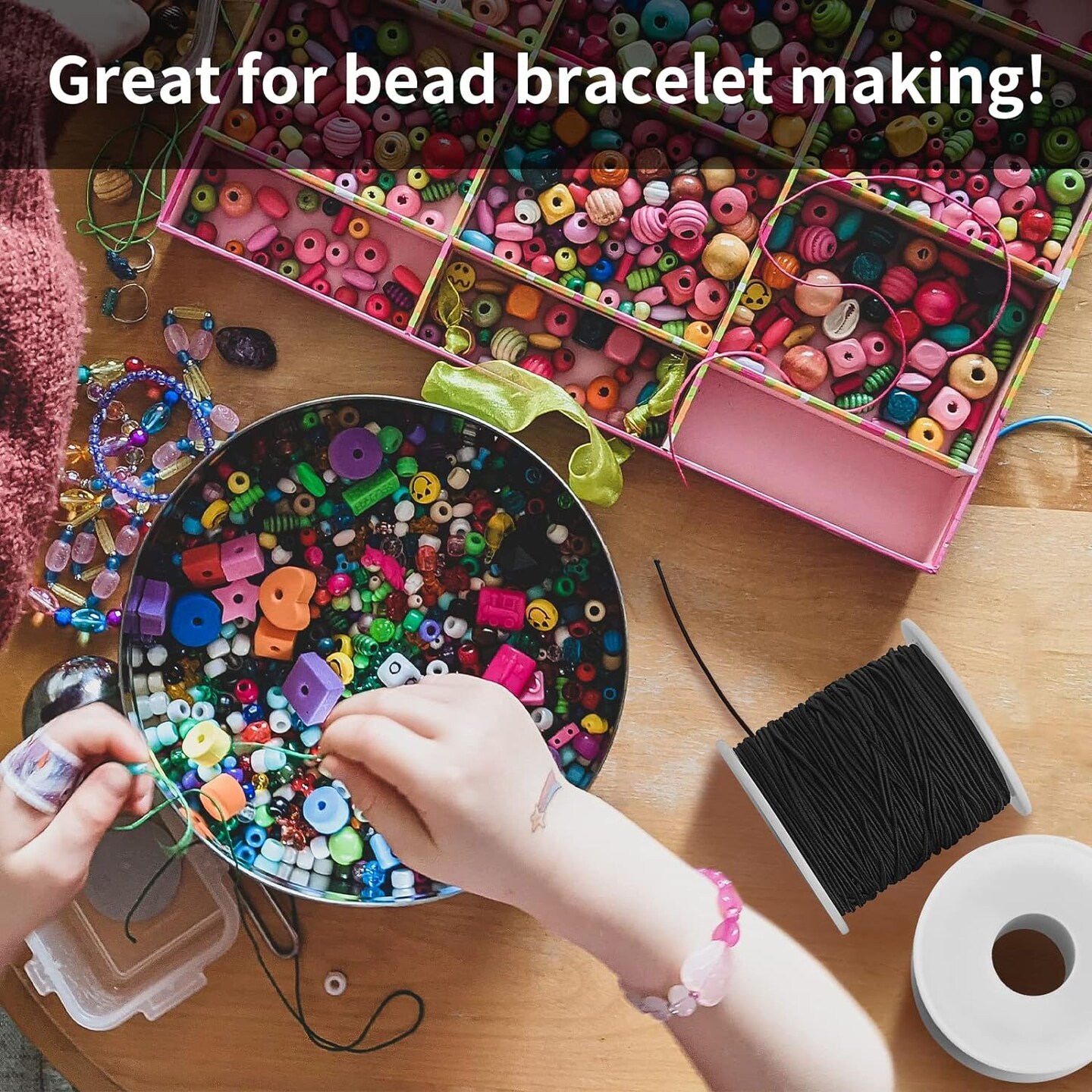 Elastic String for Bracelets Making - 2 Rolls 1.2MM Black Elastic Cord Total 109 Yards, Sturdy Stretchy Bracelet String Elastic String for Jewelry Making, Necklaces, Beading