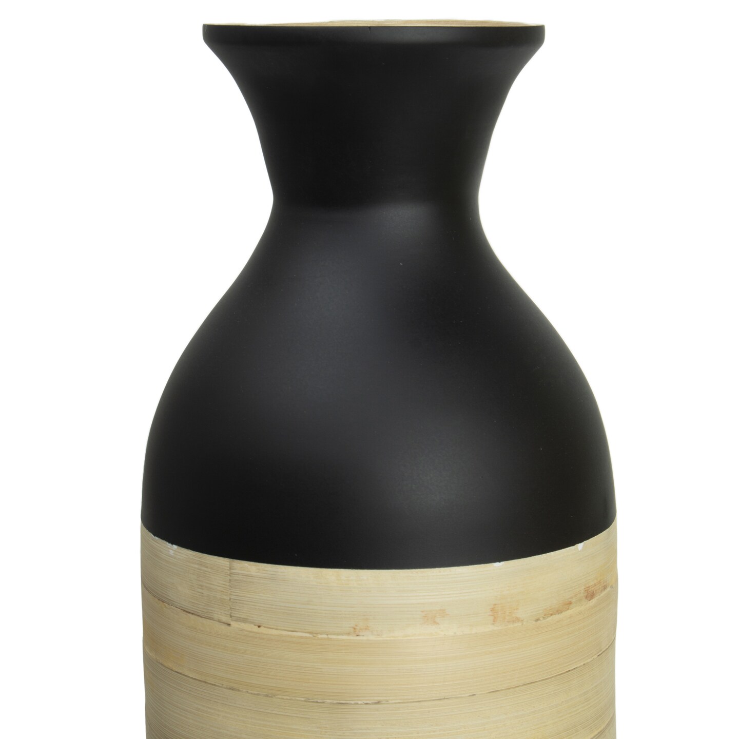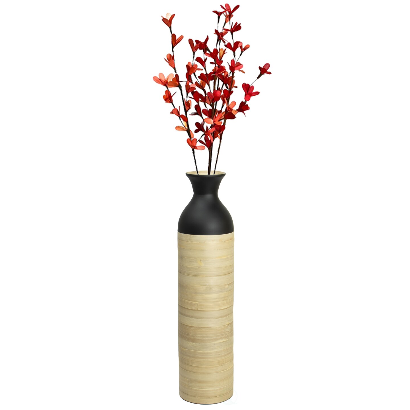 Elegant Black or White Cylinder Shaped Tall Spun Bamboo Floor Vases, Embellished with a Glossy Lacquer, and Enhanced with Natural Bamboo Finish - Stylish Home Decor, Heights of 31 and 23.5 Inches