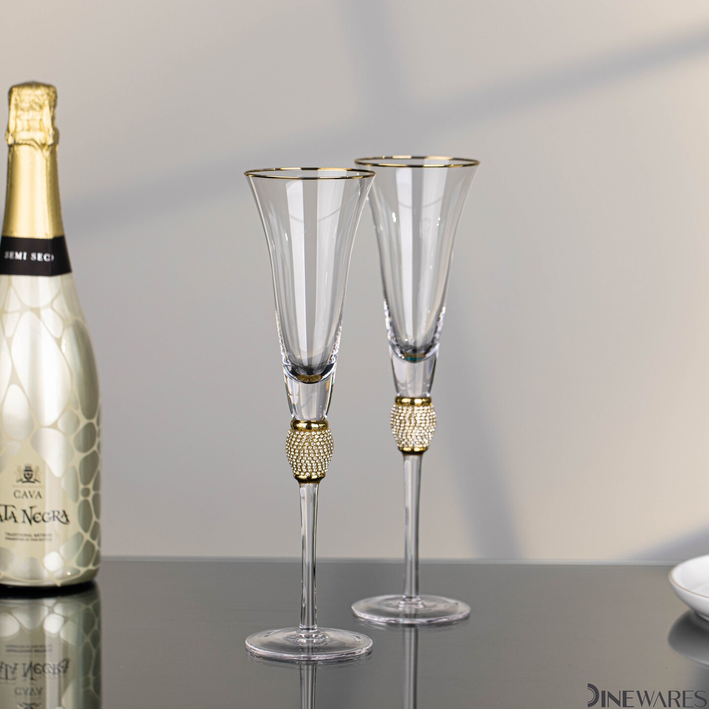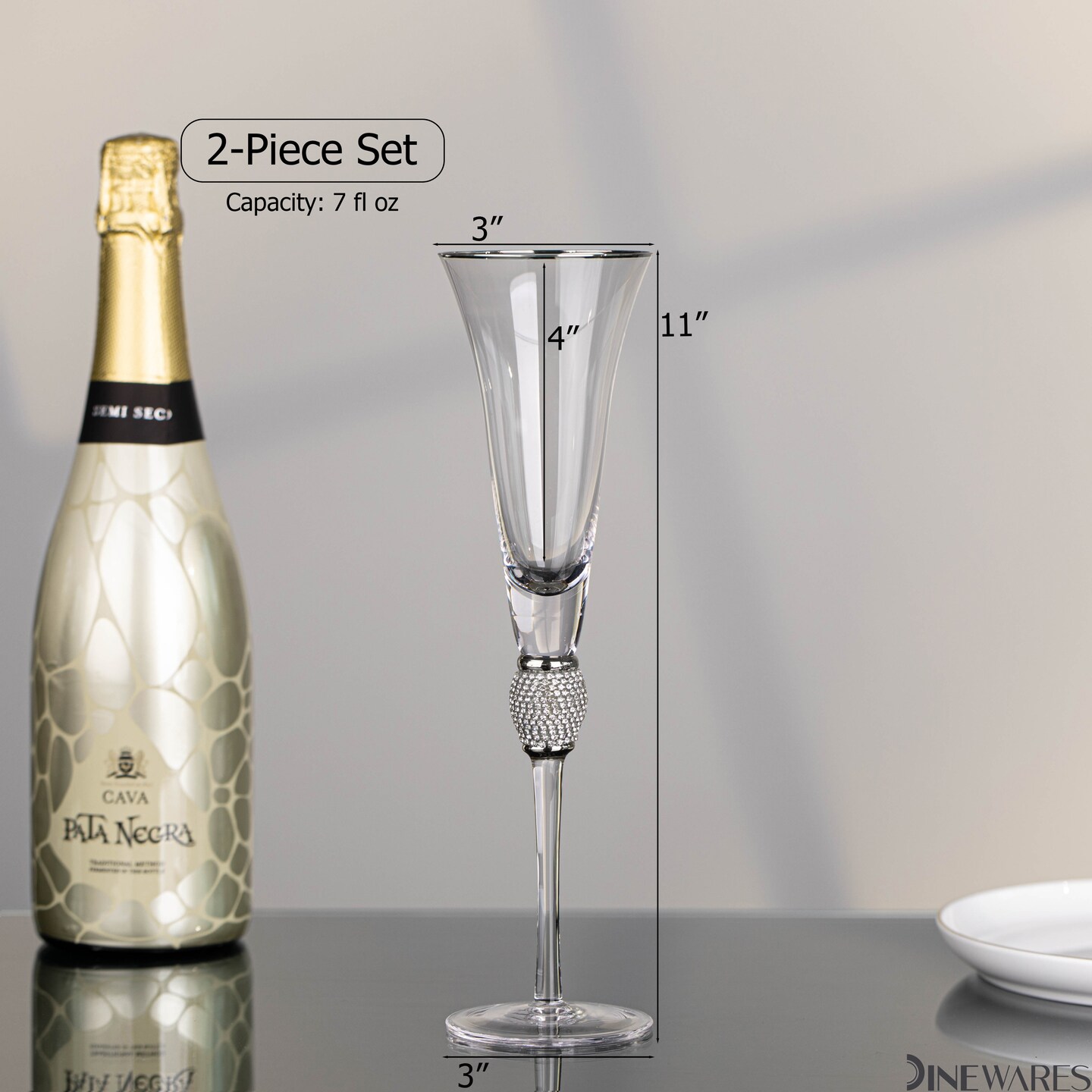 Elegant Crystal Set Wedding Champagne Glasses with Diamond Rhinestone Accents and a Polished Rim - 11 in Tall with Slender Long Stems, 7 oz - Chic Toasting Set for the Bride and Groom