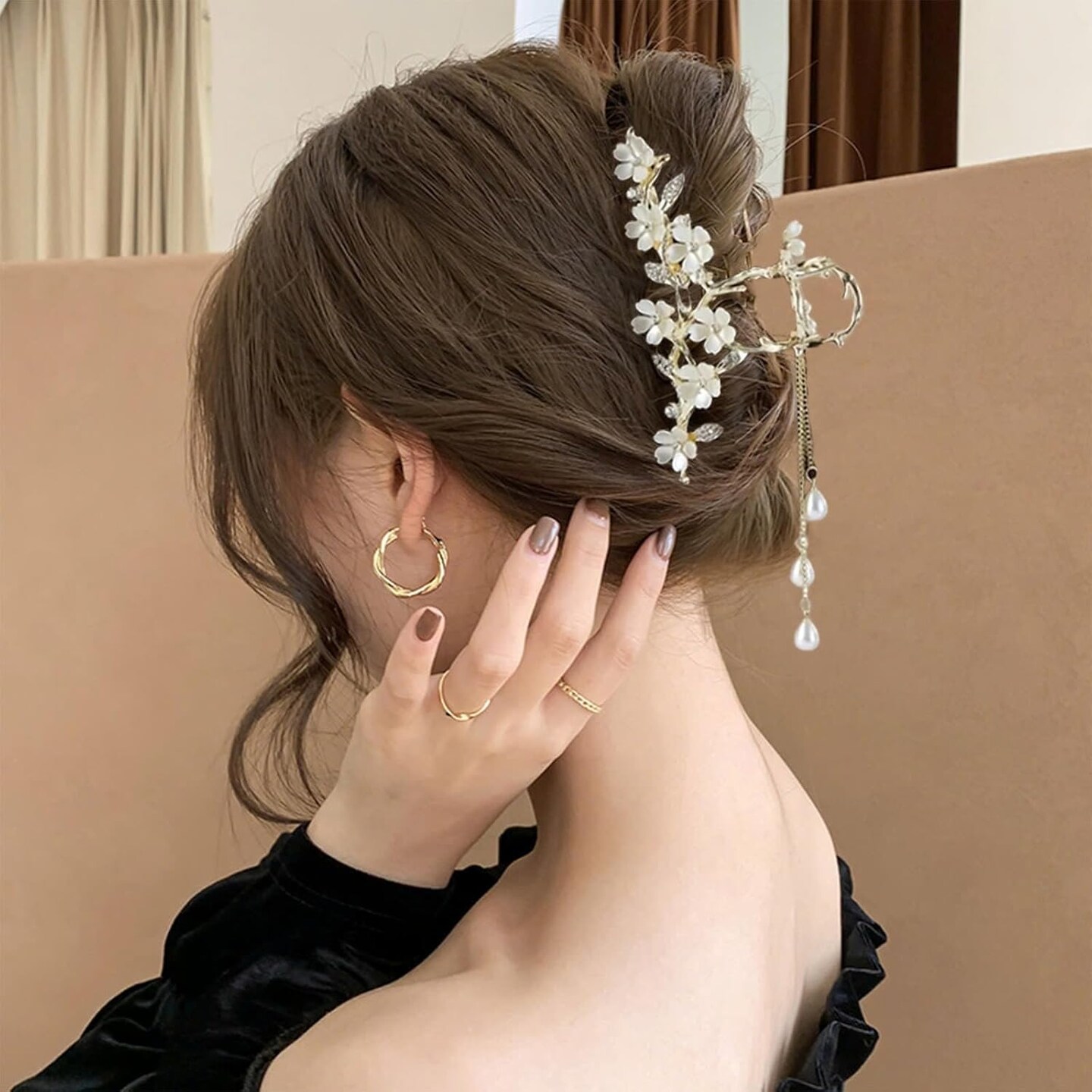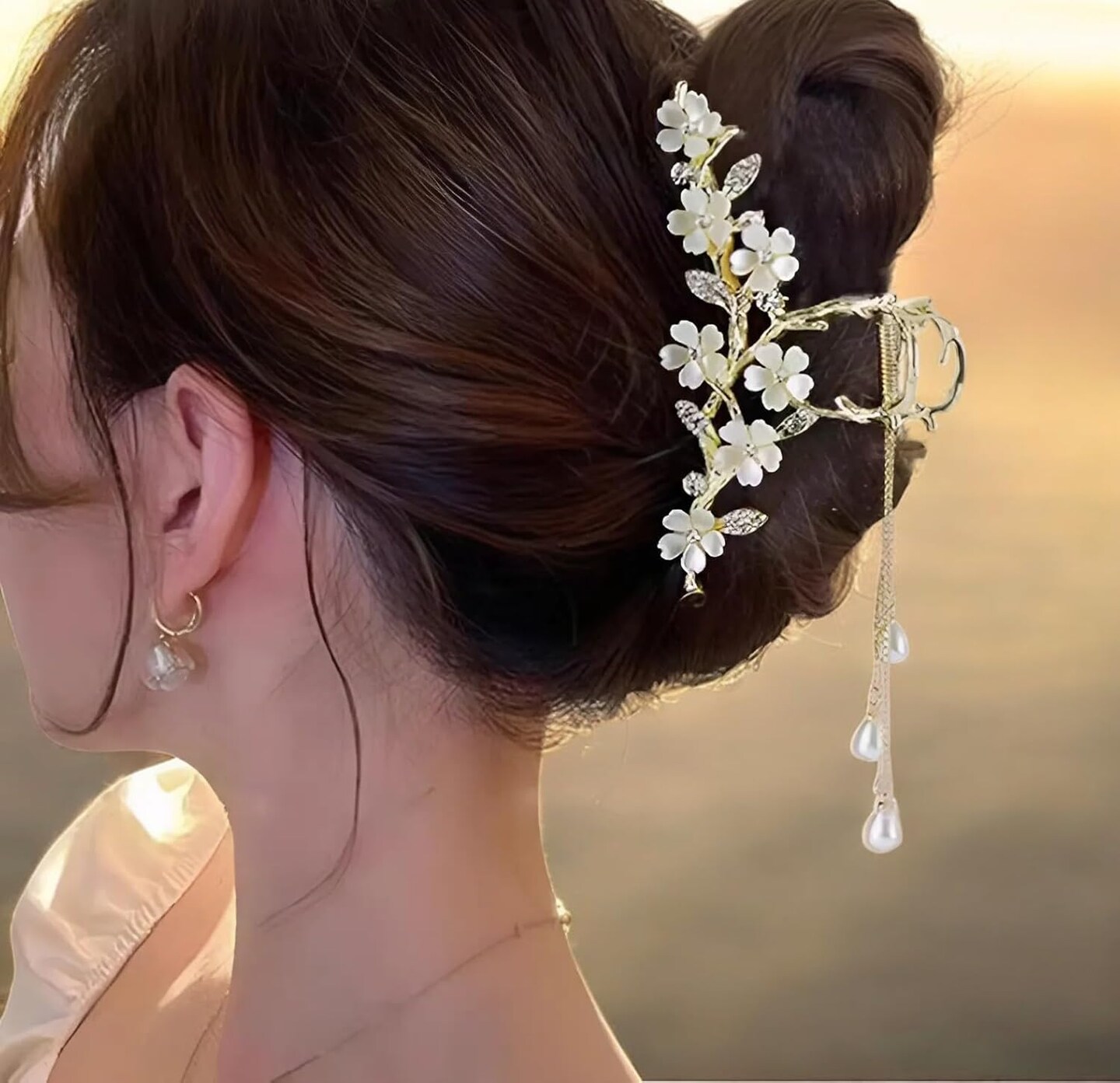 Elegant Floral Hair Clip, Pearl Tassel Bun Holder, Gold Lily of The Valley Design with Dangling Pearls