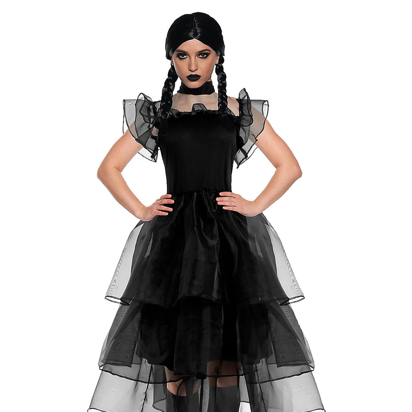 Elegant Womens Gothic Prom Dress with Layered Sheer Skirt and Ruffled Sleeves