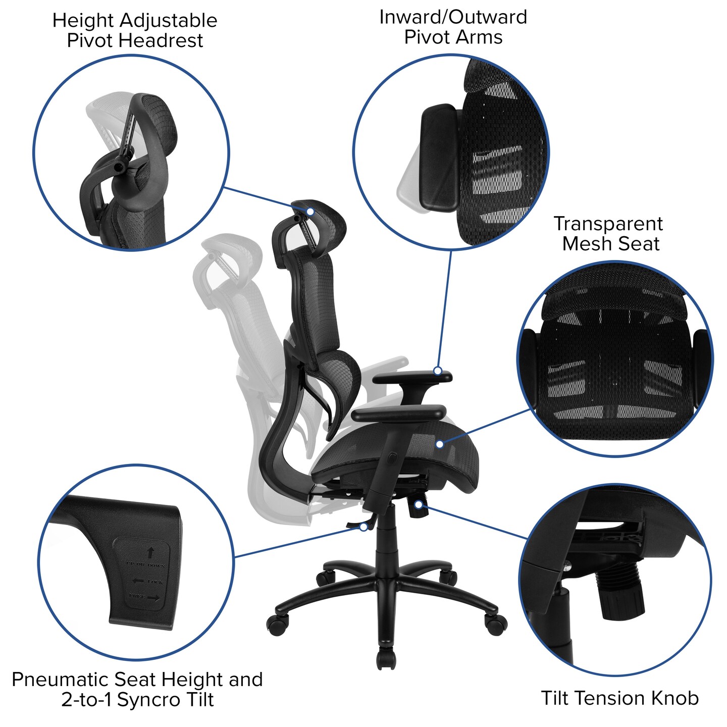 Emma and Oliver Ergonomic Mesh Office Chair-Synchro-Tilt, Headrest, Adjustable Pivot Arms
