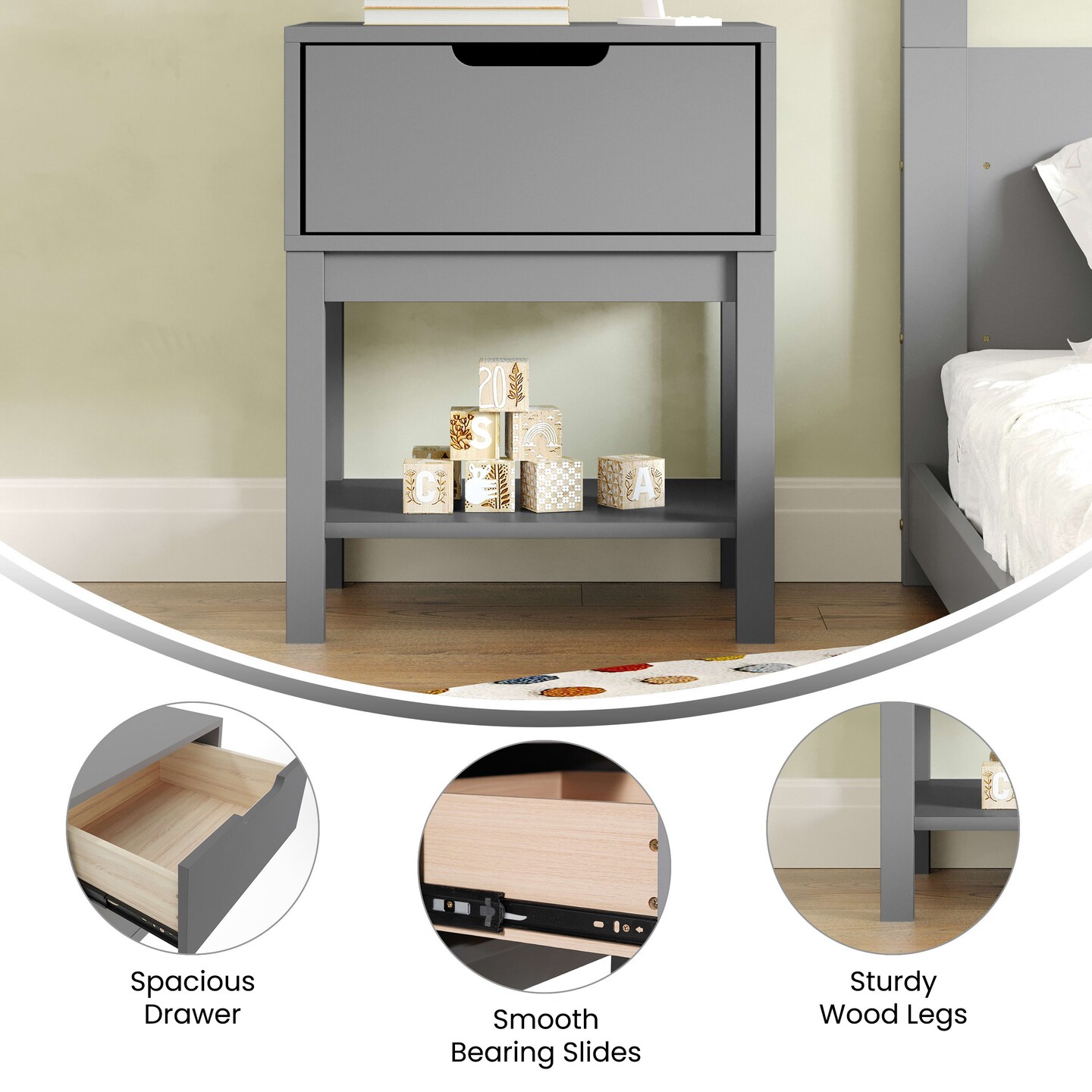 Emma and Oliver Samuel Kids Single-Drawer Night Stand with Solid Wood Frame, Side Table for Kids Bedroom with Open Shelf