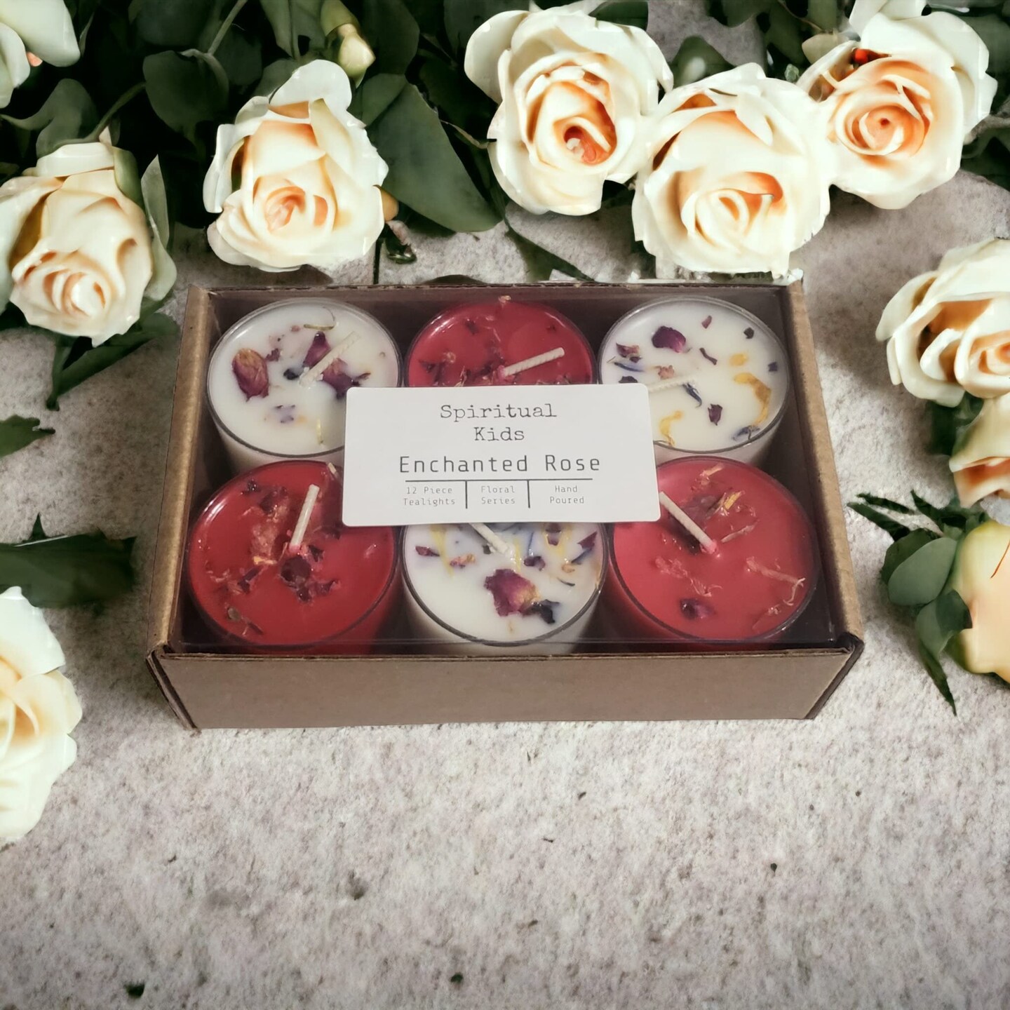 Enchanted Rose All Natural Soy Wax Tealights Hand Poured with Fragrant/Essential Oils and Dried Flowers! | Floral Tealights | Red & White