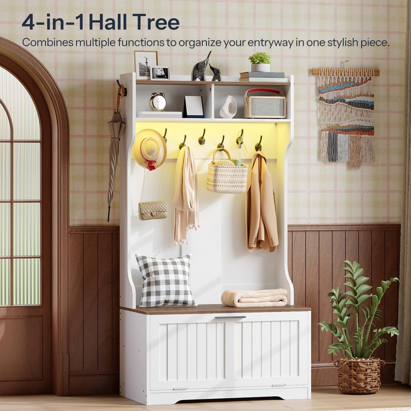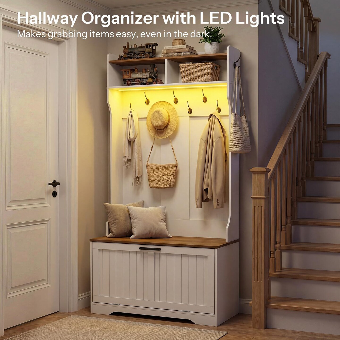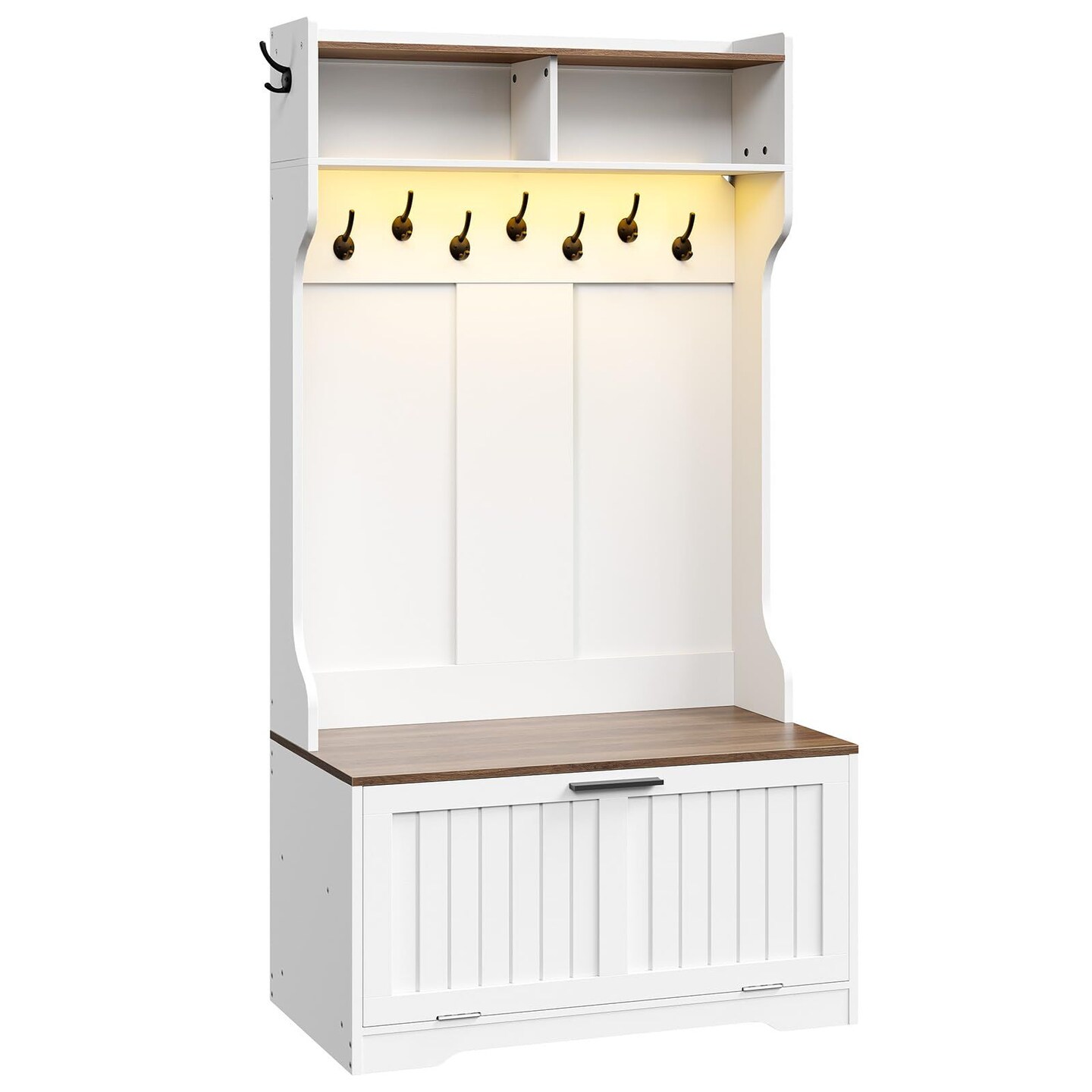 Entryway Hall Tree with Shoe Cabinet, Bench, 9 Hooks, LED Shelf