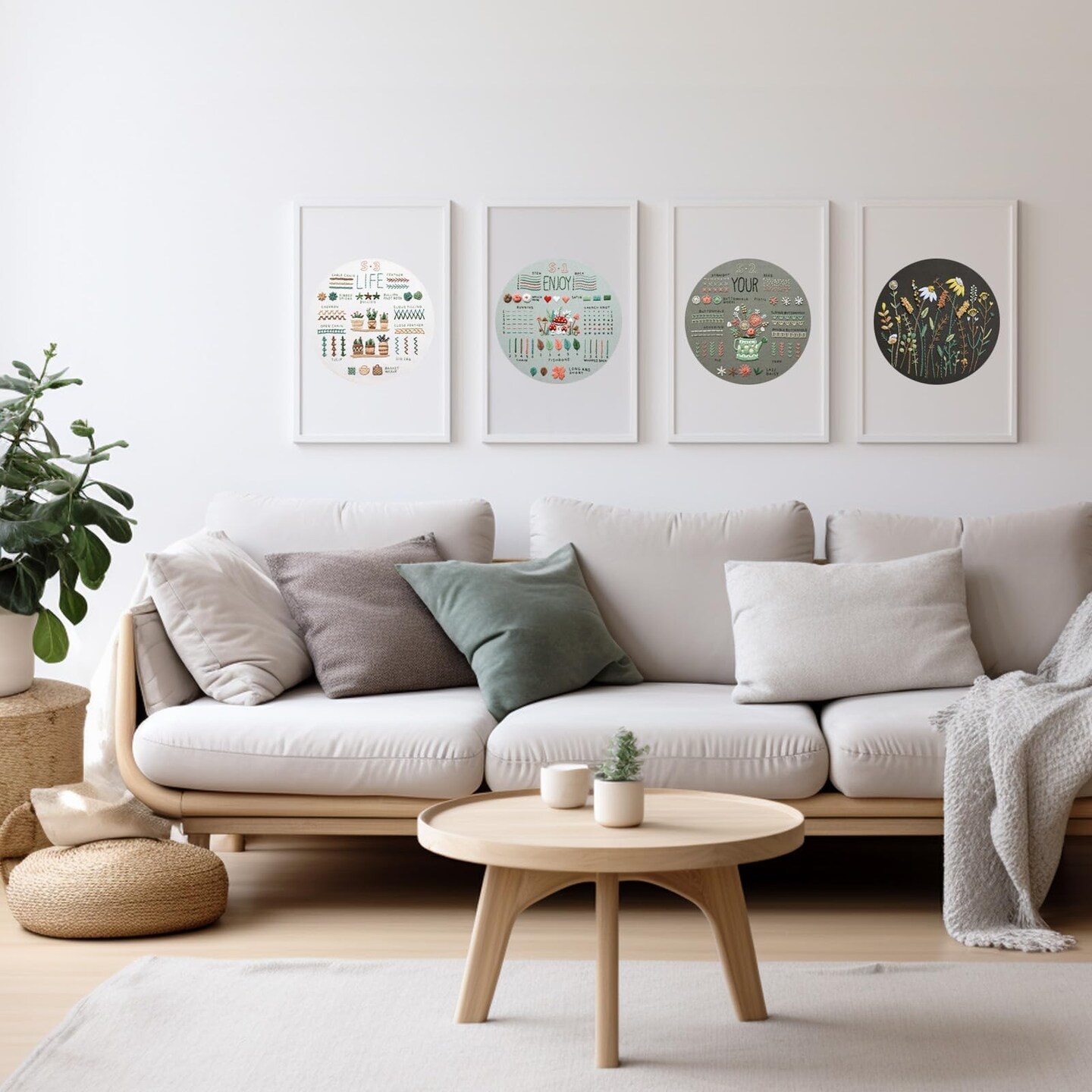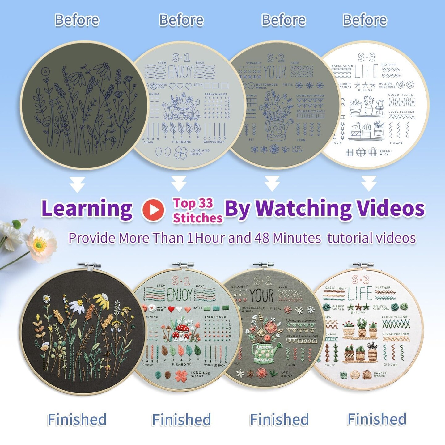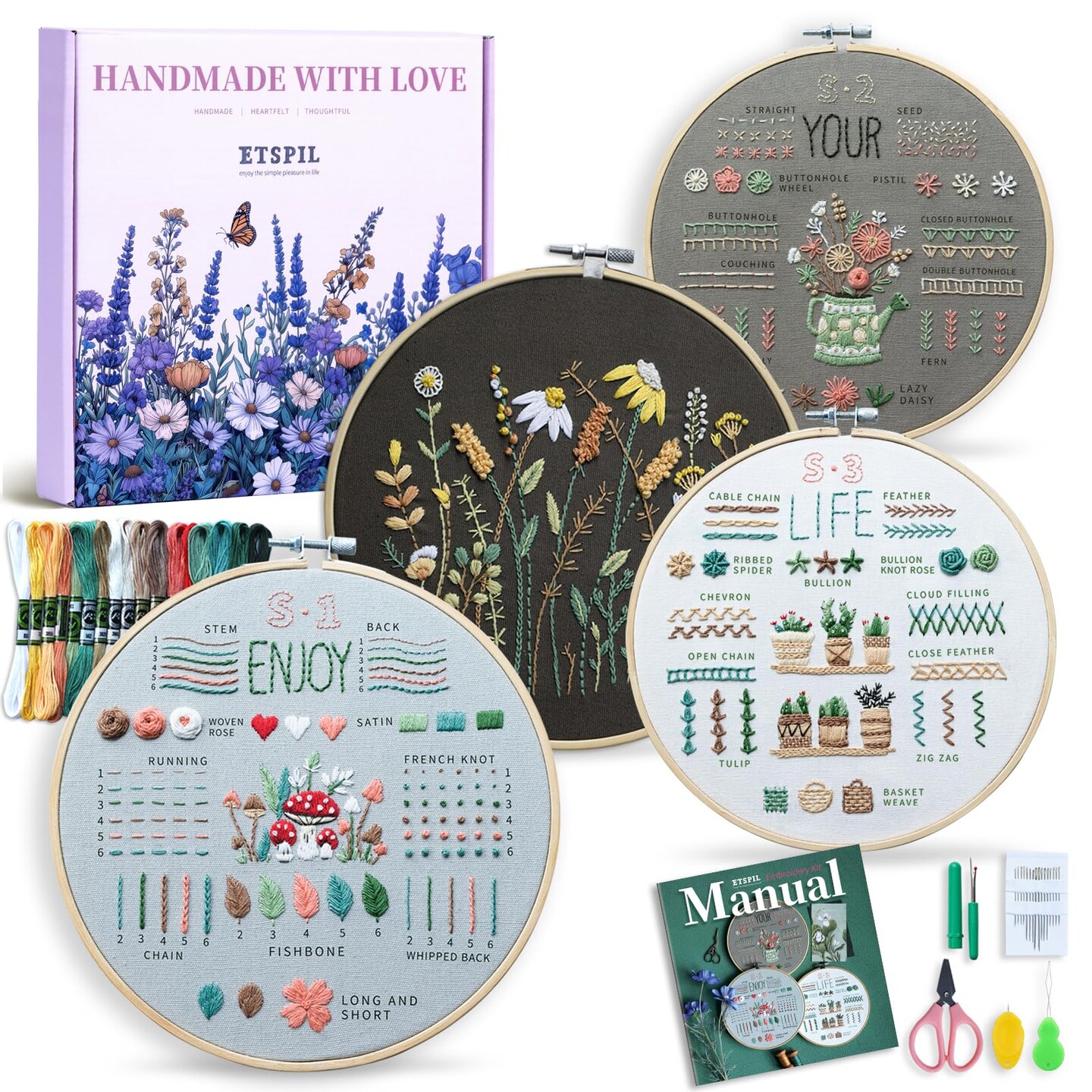 ETSPIL Embroidery Kit for Beginners, 4 Floral Patterns, Learn 33 Stitches, Pre-Printed Fabric, 7.8-Inch Hoop, Colored Threads and Needles, Easy Video Guide, DIY Hand Sewing Gift for Adults and Teens