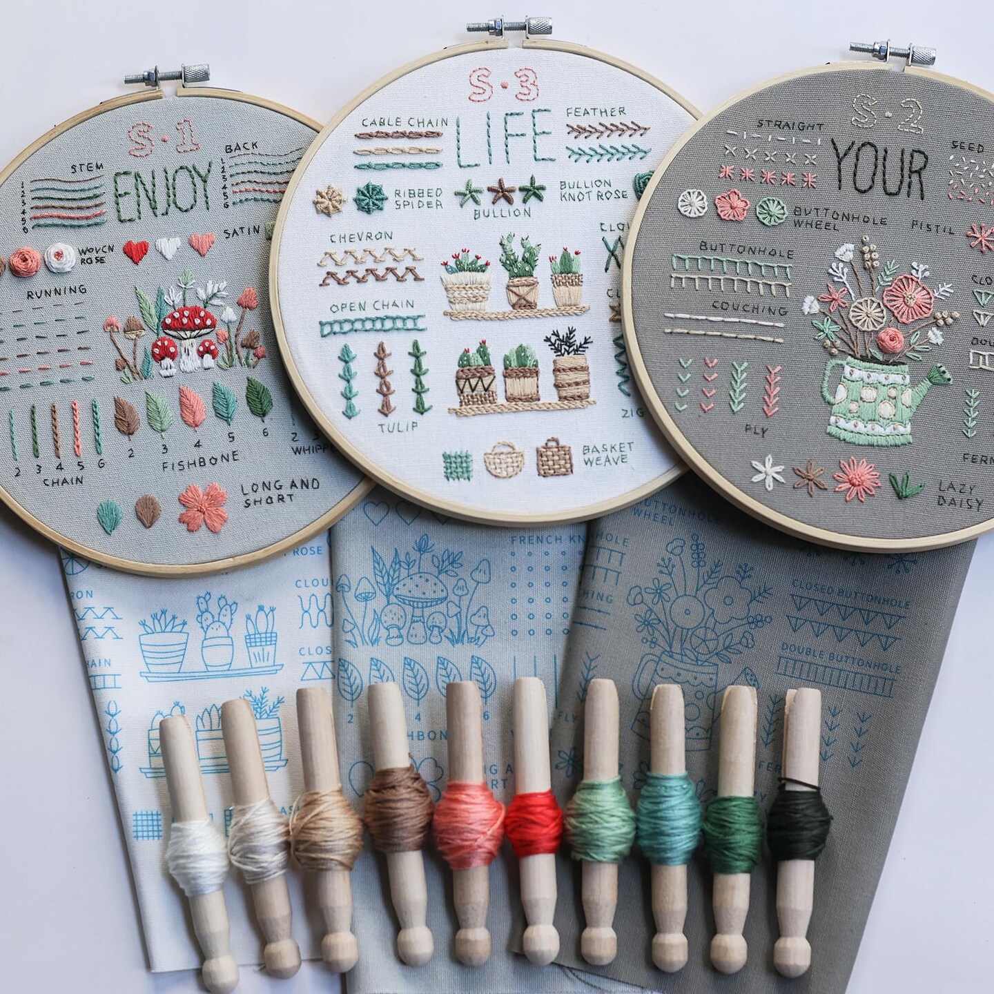 ETSPIL Embroidery Kit for Beginners & Adult, 3-Pack 33-Stitch Floral Samplers, Pre-Stamped Designs, 7.8-Inch Hoop, Threads, Needles, Storage Bag, Guide & Video, DIY Craft Gift for Women
