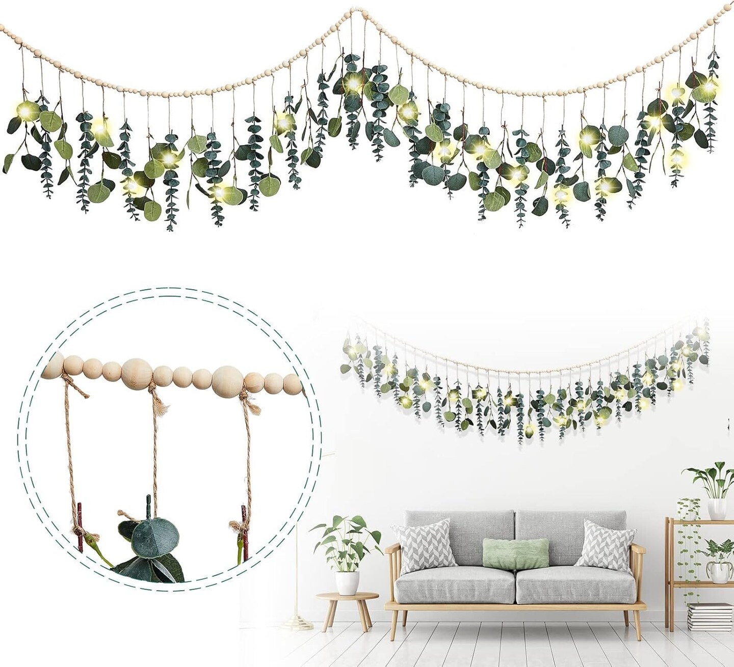 Eucalyptus Wall Decor with Led Light Wall Hanging Wooden Bead Garland