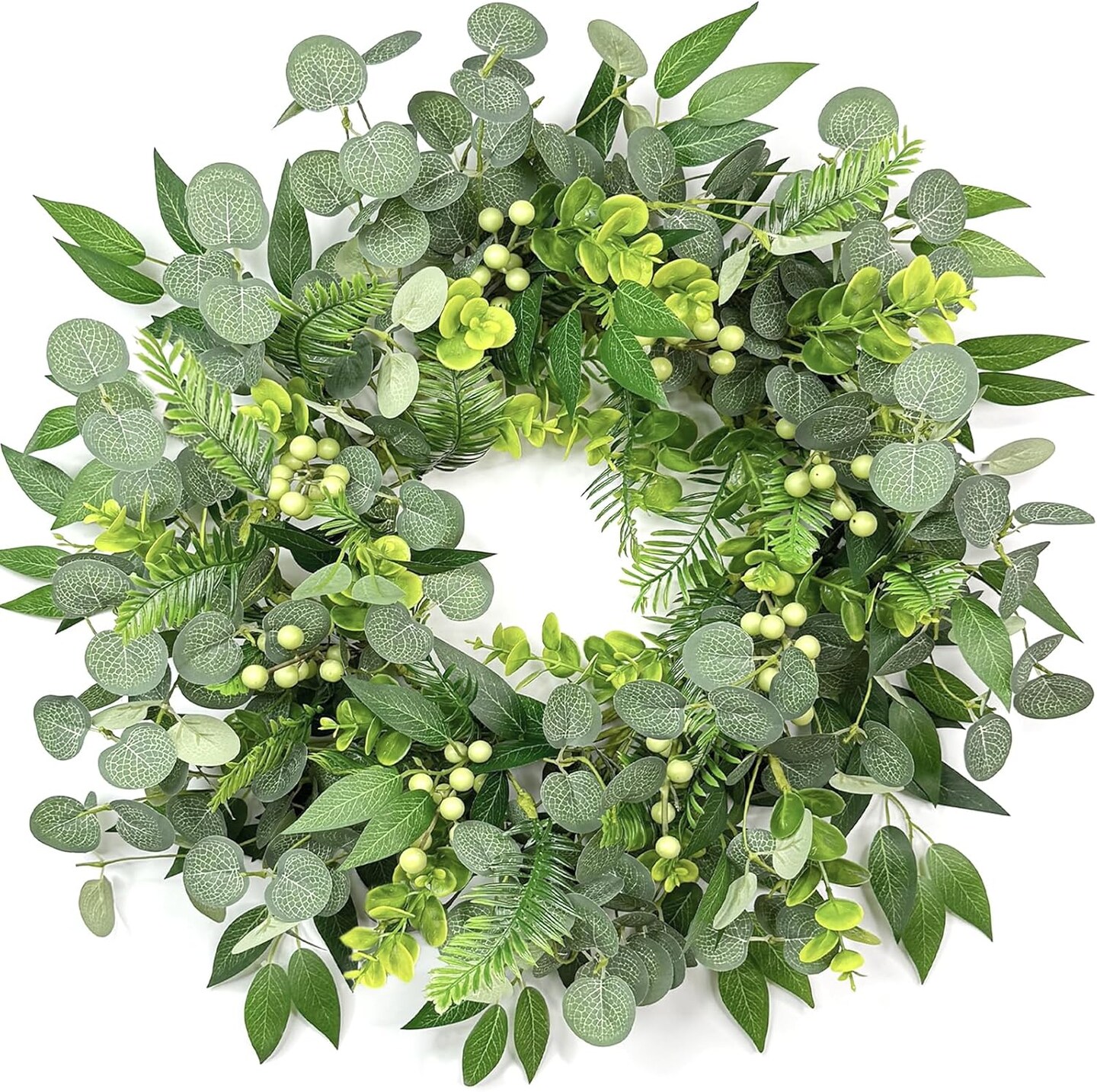 Eucalyptus Wreath with Berry 20" Green Spring Wreaths for Front Door Artificial Greenery Boxwood Fern Indoor Outdoor Decoration