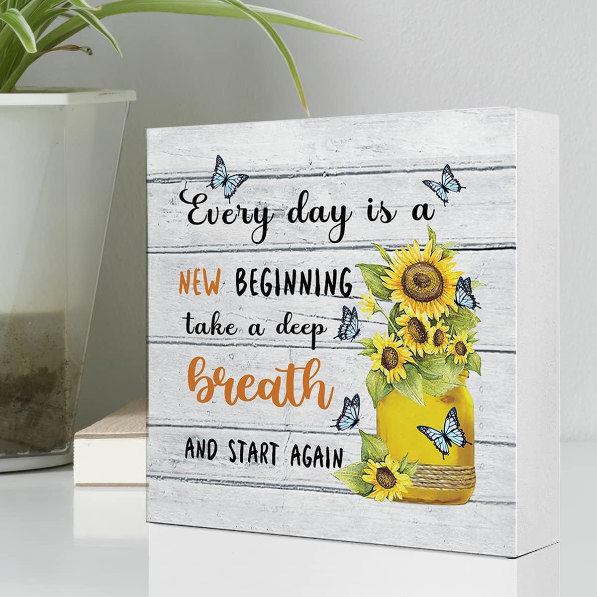 Everyday Is A New Beginning Farmhouse Sunflowers Wooden Sign Desk Decor,Inspirational Wood Block Sign Desk Decorations for Home Bedroom Dorm Office Desk Shelf Table Decor