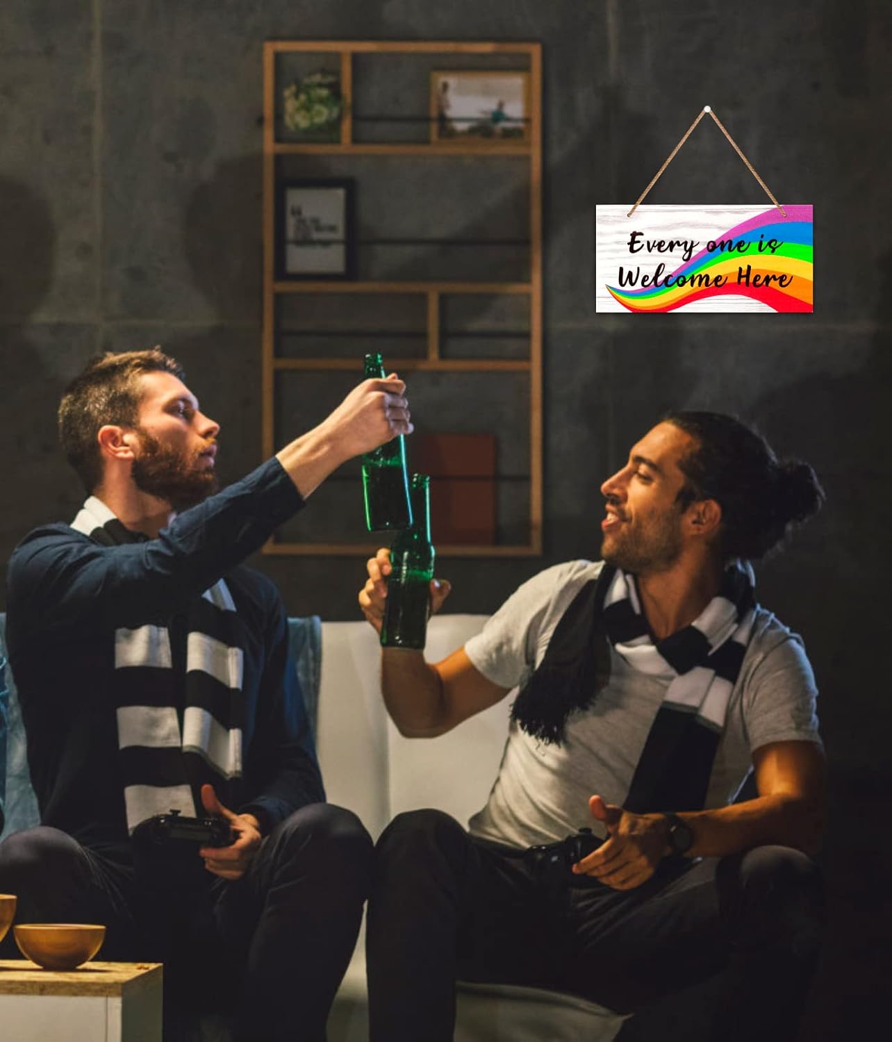 Everyone Is Welcome Here Door Sign - 6"x12" Rainbow Gay Lesbian Pride Welcome Sign Door Decorations LGBTQ Door Hanging Sign for Home School Office Party Wall Front Door Decor