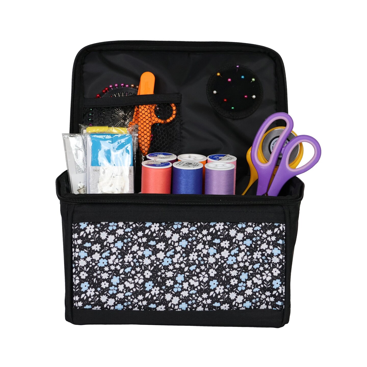 Everything Mary Sewing Kit Organizer Box, Blue Floral - Supplies Storage Basket for Supplies and Accessories - Organization for Thread, Needles, Notions & Scissors - Portable Craft Caddy