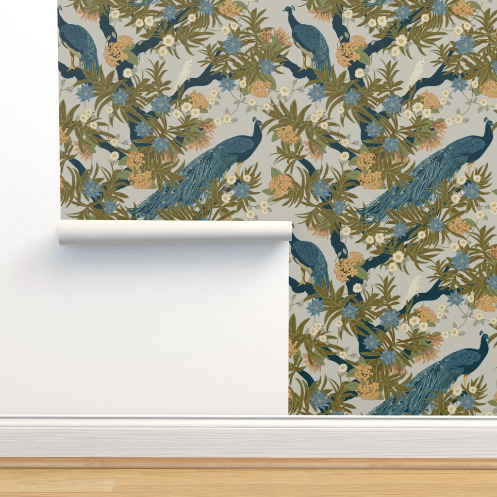 Exotic Peacock Floral Cockatiel Tropical Botanical Tree Maximalist Large Scale Birds Custom Removable Wallpaper by Spoonflower Peel & Stick Wallpaper 2FT Wide