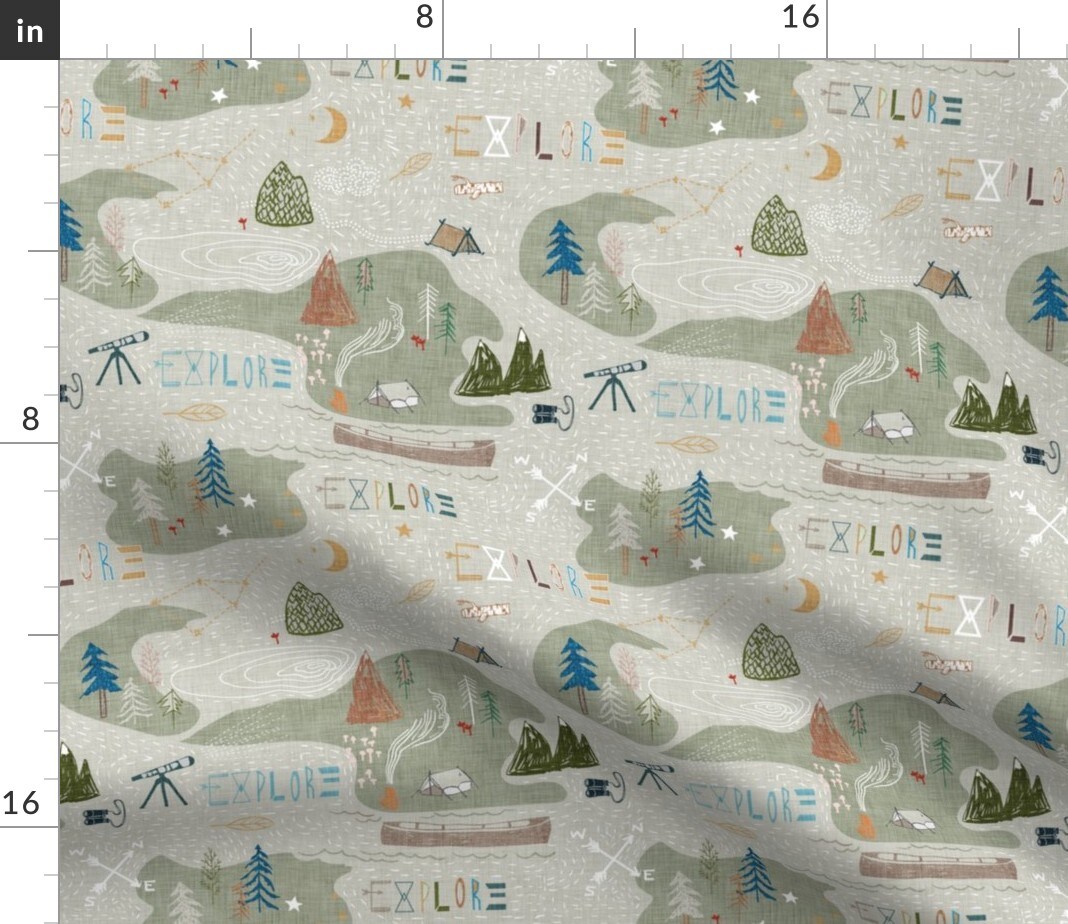 Explore Sage Mountain Map Camping Hiking Outdoors Lake Tent Fire Forest Woods Custom Printed Fabric by Spoonflower Various Fabrics by the Yard or Fat Quarter