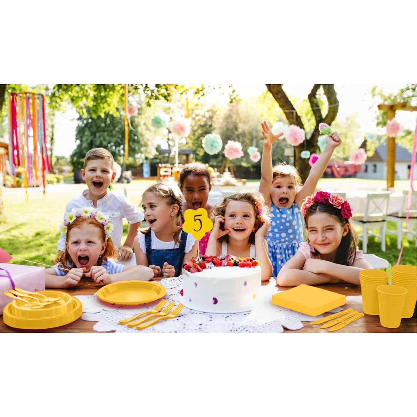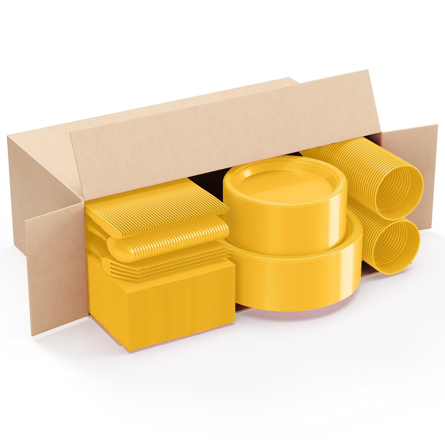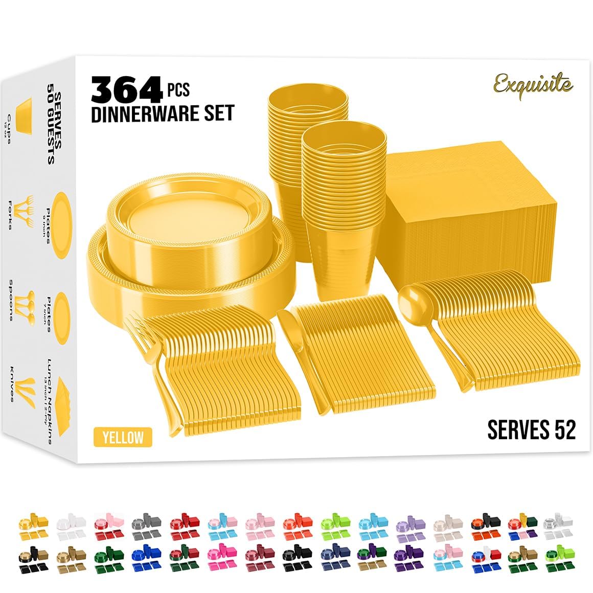 Exquisite 350 Pcs Plastic Plates for Party – Disposable Plates Set – 50 Each of 9" Dinner Plates, 7" Dessert Plates, Plastic Cups, Napkins & Plastic Cutlery – Plastic Dinnerware by Party Solids