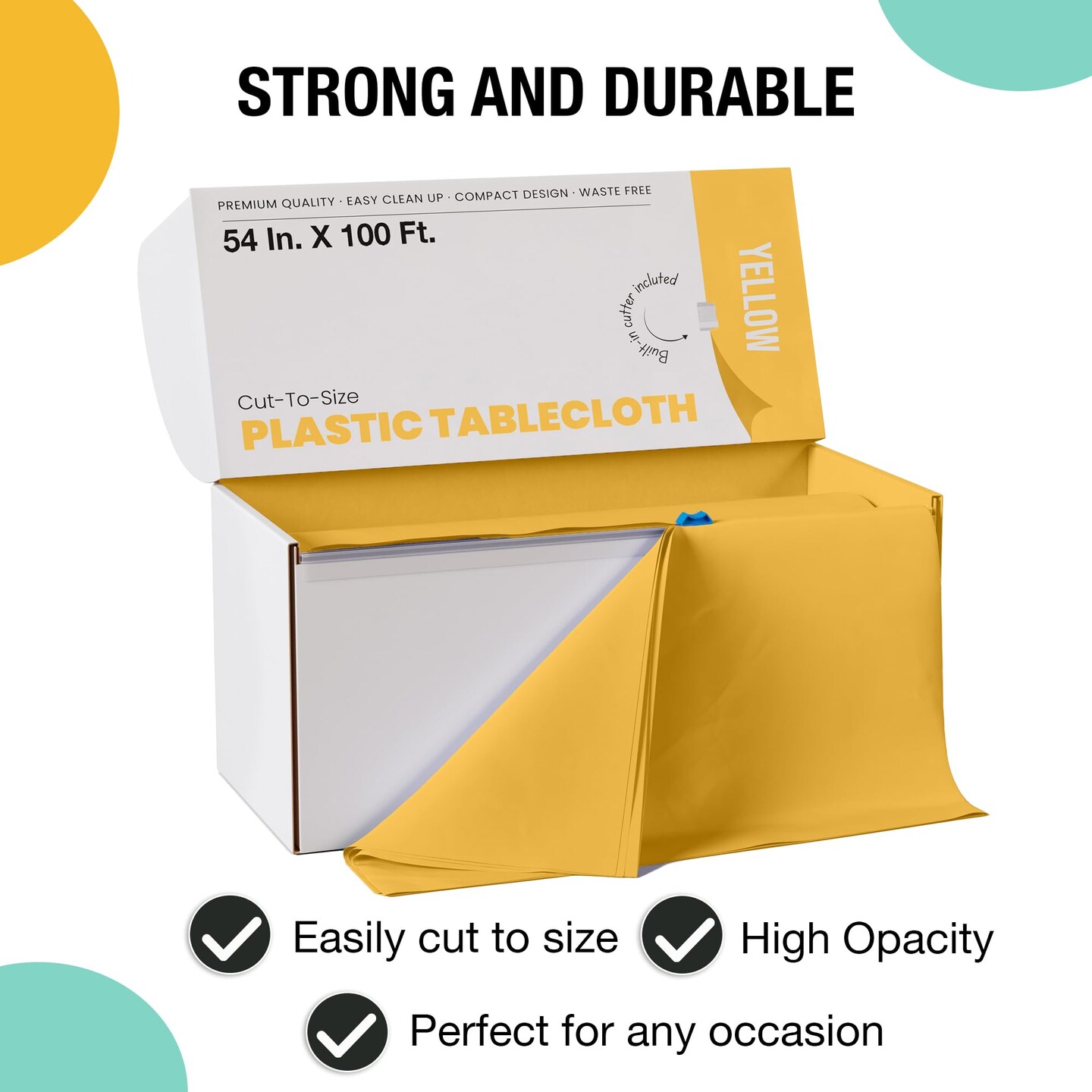 Exquisite Party Solids 54" x 100' Plastic Table Cover Roll with Slide Cutter – Cut-to-Size Dispenser Box – Makes Up to 12 Disposable 8' Rectangle Tablecloths