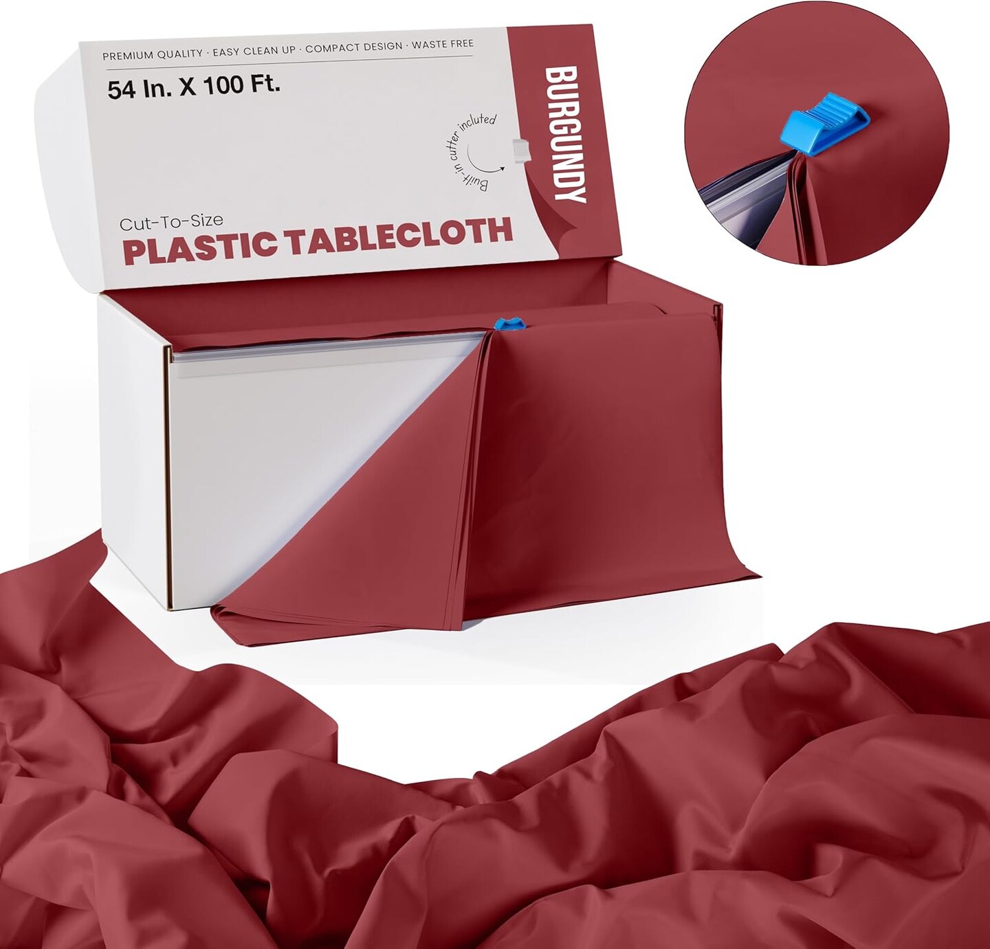 Exquisite Party Solids 54" x 100' Plastic Table Cover Roll with Slide Cutter – Cut-to-Size Dispenser Box – Makes Up to 12 Disposable 8' Rectangle Tablecloths